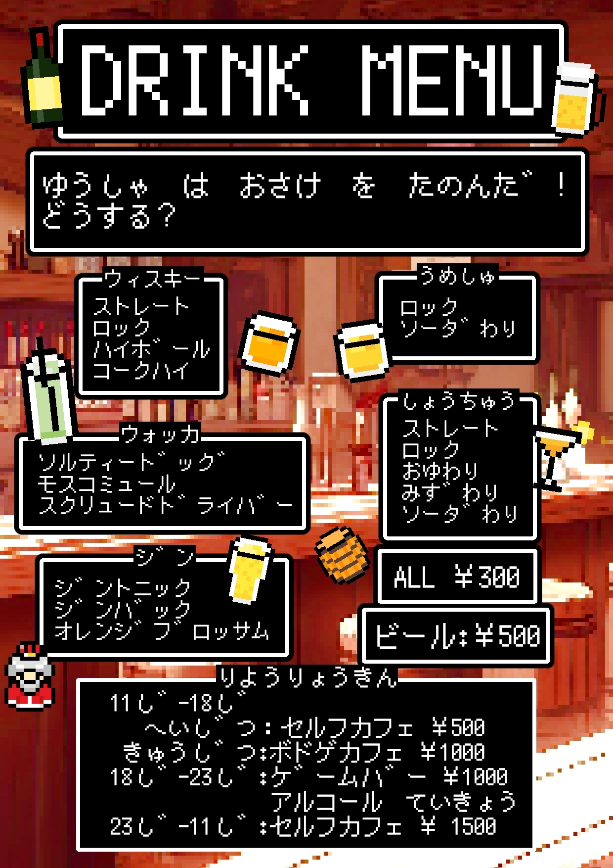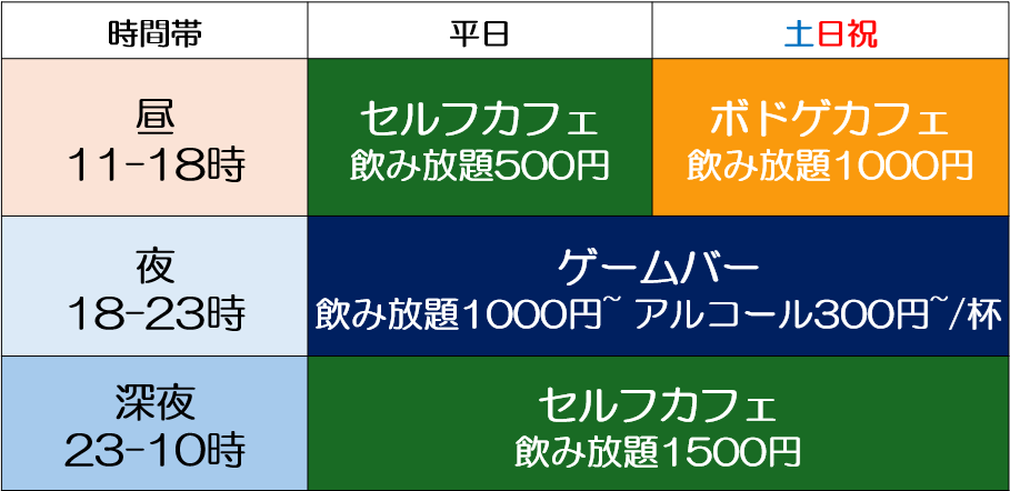 | 料金レンジ | フリードリンク500円~フリードリンク1000円+アルコール1杯300円~ |