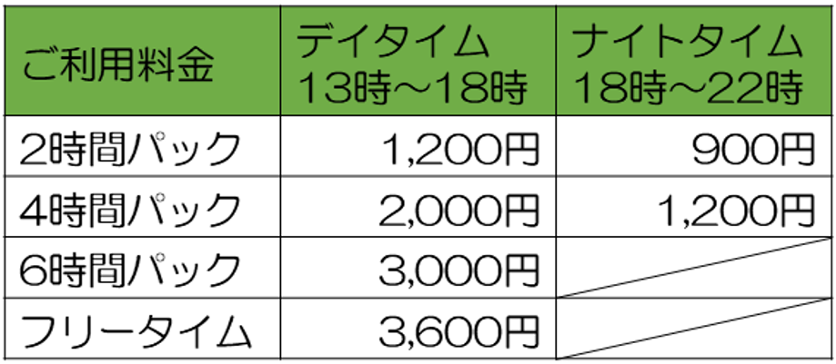 - ご利用料金は前払いとなります。受付時に、ご利用時間を決めて、ご利用料金をお支払いください。