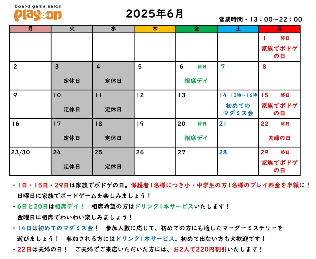 - 5ヶ月前2025年07月18日 21時47分頃8月のカレンダーと、プレイオン感謝デイ開催のお知らせ当店は8月2日で開店より2.5年となります。日頃の感謝を込めて、8月1日より10日まで、プレイオン感謝デイとしてサイコロチャレンジイベントを開催いたします!是非この機会に足をお運びください! また、8月は日程が通常と異なっております。ご注意ください。22ページビュー