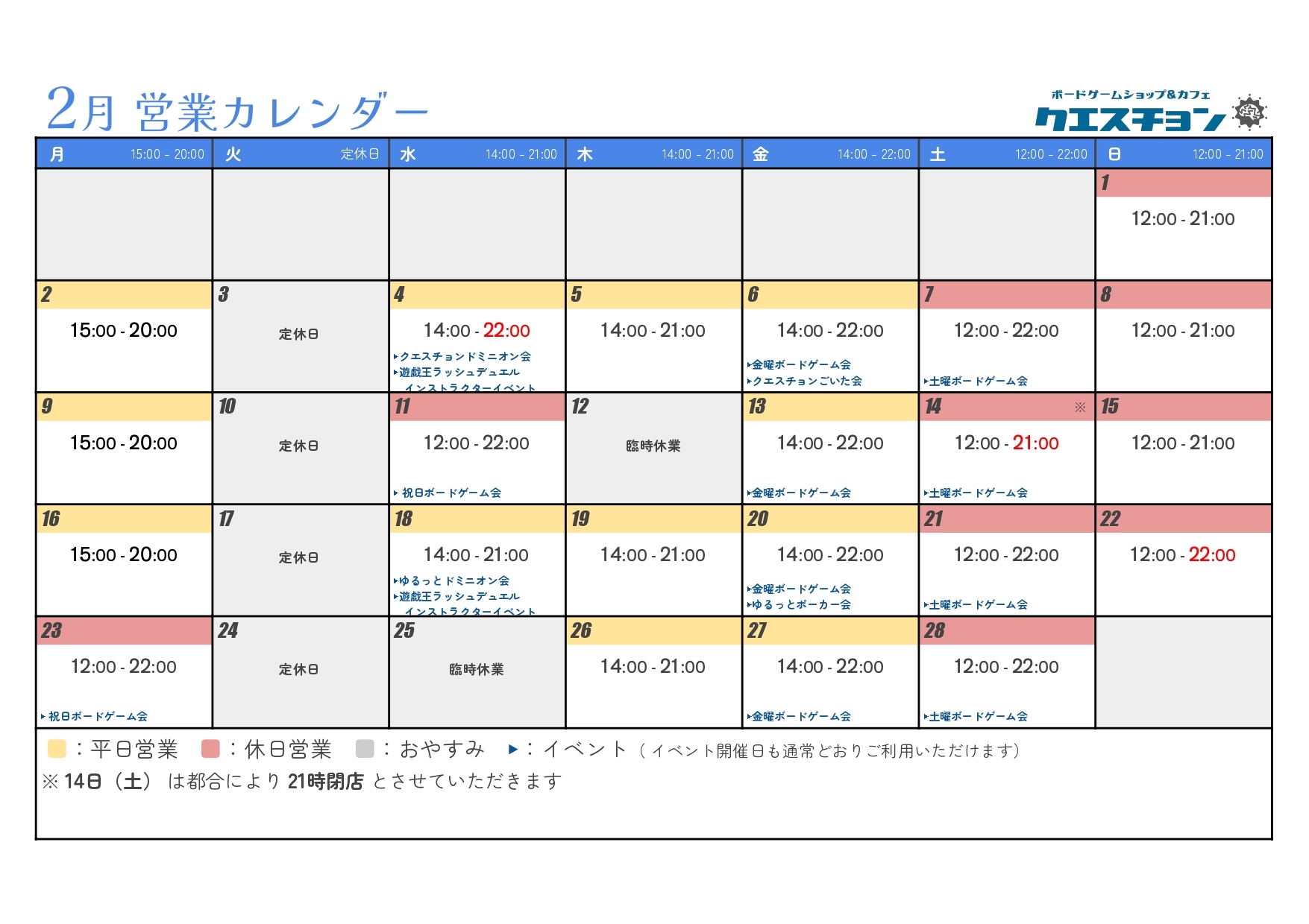 - 2年以上前2023年07月30日 19時01分頃【イベント】8月の営業日とイベントのご案内ボードゲームショップ&カフェクエスチョンです!8月はお盆の関係で多数のボードゲーム会を開催予定です。数が多いのでまとめてみます。興味のあるゲームのイベントや空いてる日のゲーム会にはぜひぜひご参加ください!お盆ボードゲーム会(8/11・13・15)お盆期間、お店主催のボードゲーム会を開催します!...631ページビュー