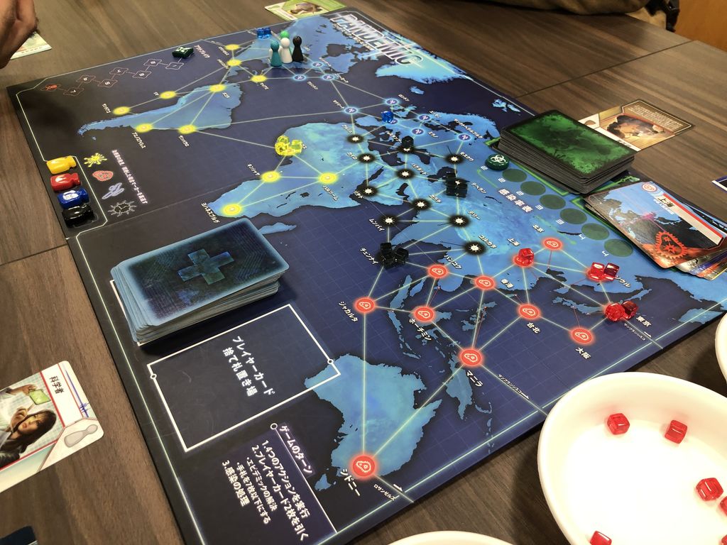 時勢的にはぴったりなテーマのゲームで、実際にメーカーさんでも品切れになったとか。4種類のウイルスと戦わなくてはいけないんですが、「4種類も!?」というリアクションがあって、1種類でもてんてこ舞いな現状を考えると確かに大変な状況ですね。
