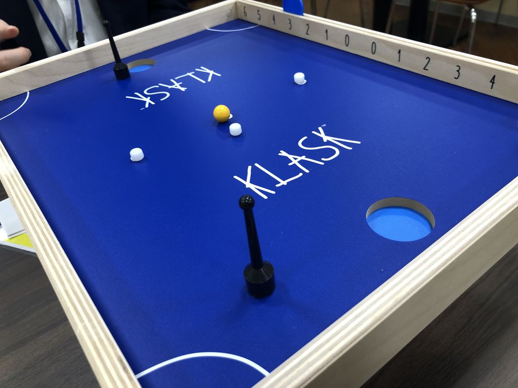 黄色いボールを相手のくぼみに入れたら得点なんですが、真ん中の白い磁石2つがくっついたり、自分のコマが動かせなくなったりしたら相手の点になってしまいます。