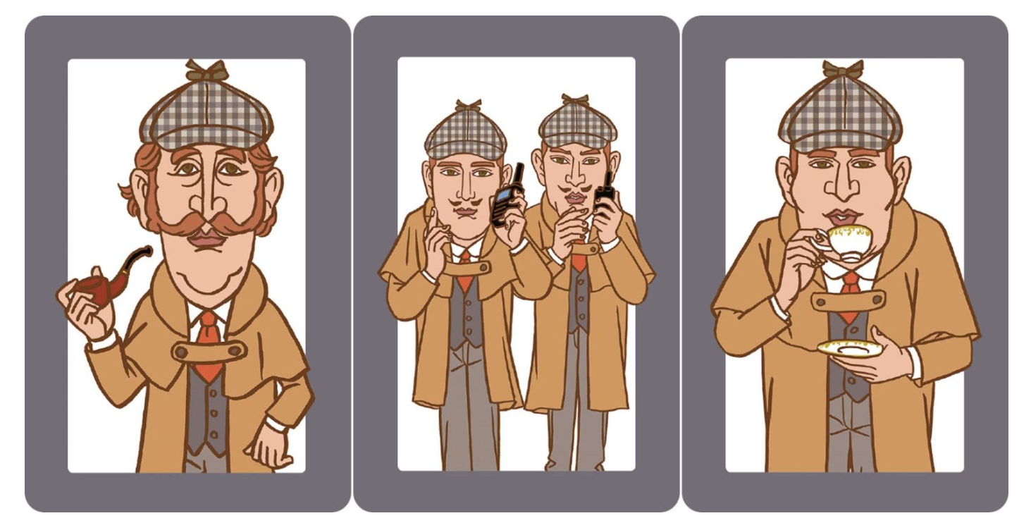 プレイヤーは、手持ちの山札から画像のような探偵カードを共通の場にオープンし、それまでの数字に続いて探偵の数を声に出して数えます。間違えると、それまでに貯まったカードを手持ちに加えなければなりません。全てのカードを出し切ったプレイヤーの勝利です。