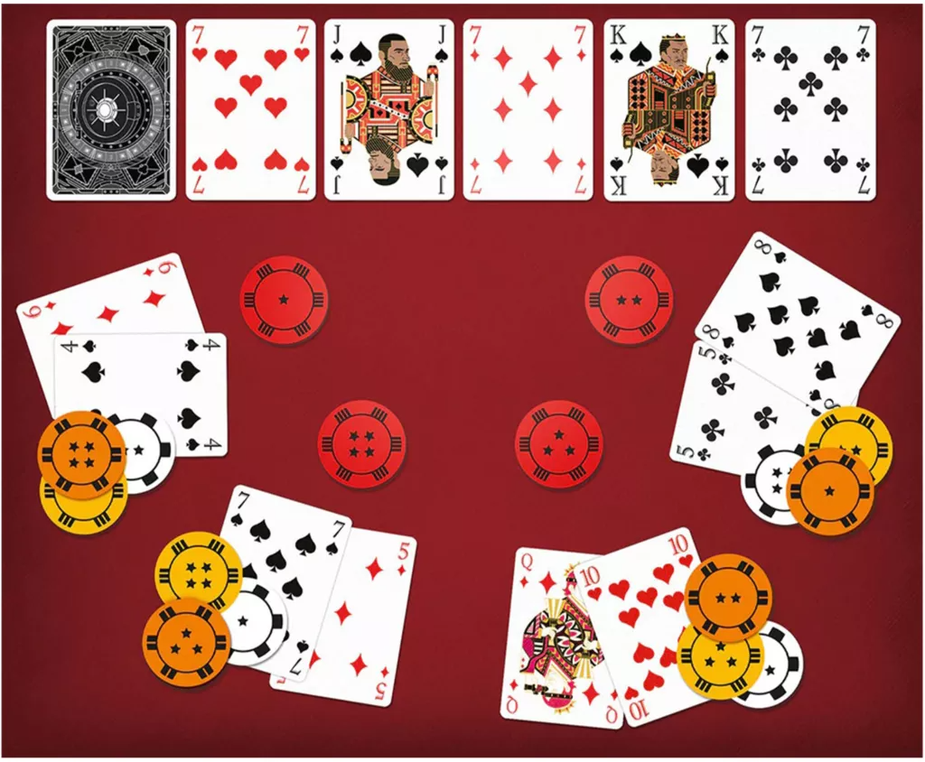 このゲームは協力型ポーカーで、互いの強さの順位を正しく予想することを目指します。予想タイムは全4回あり、①手札が2枚配られたとき、②場のカードが3枚オープンになったとき、③場のカードの4枚目がオープンになったとき、④場のカードの5枚目(最後の1枚)がオープンになったときの全4回行います。予想は4回目さえ当たっていればクリアです。