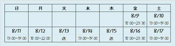 お盆の時期は少し時間を変えて営業となります。ヨロシクどうぞ。