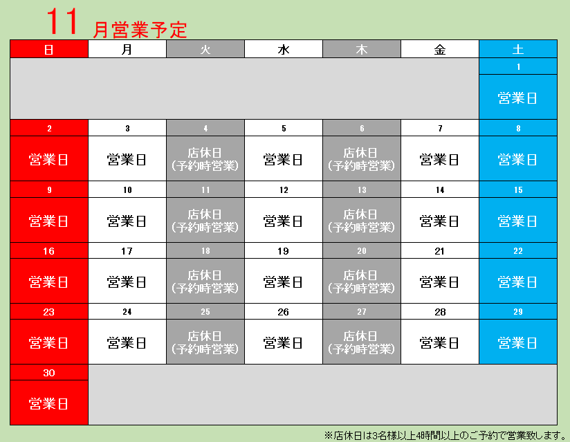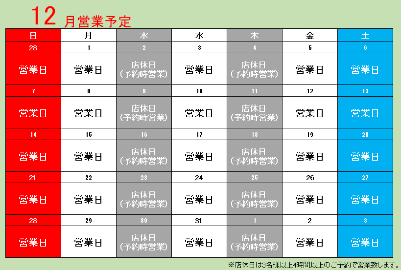 予約時営業の表記のある店休日は3名様以上でフリータイムのご利用、もしくは個室で5時間以上 のご利用で承りますので是非お問合せ下さい!