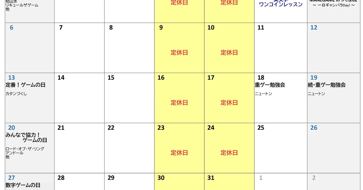 こんにちは。早速ですが、8月からボードゲーム最大料金をお安くすることにしました。これまでは最大料金を2500円とさせていただいていおりましたが、1500円に設定しました。3時間以上はかかりませんので是非ご利用ください。併せて、ご飲食代金に応じてゲームプレイ料金をお値引きサービスは終了とさせてい...259ページビュー - 5年以上前2020年08月28日 11時27分頃9月の予定