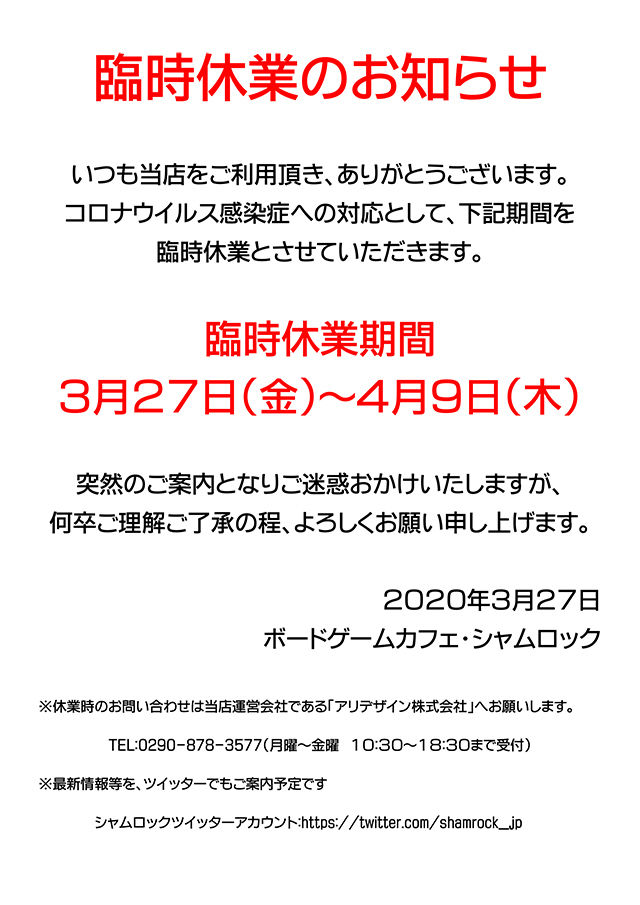 新型コロナウイルス感染症への対応としまして、下記期間を臨時休業とさせていただくこととなりました。