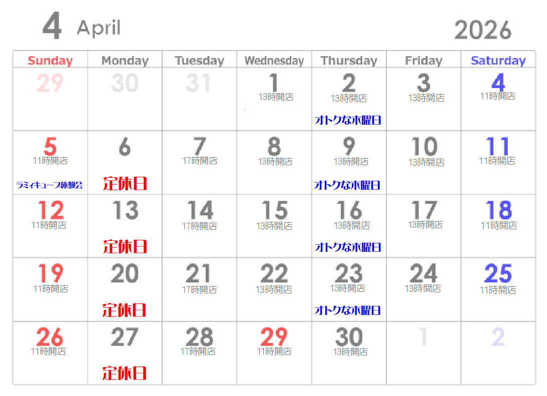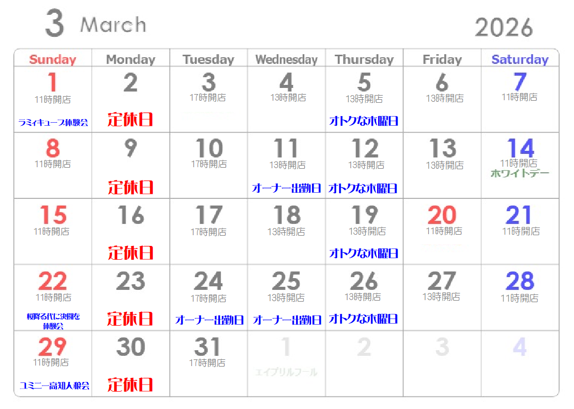3月~4月の営業カレンダーです♪