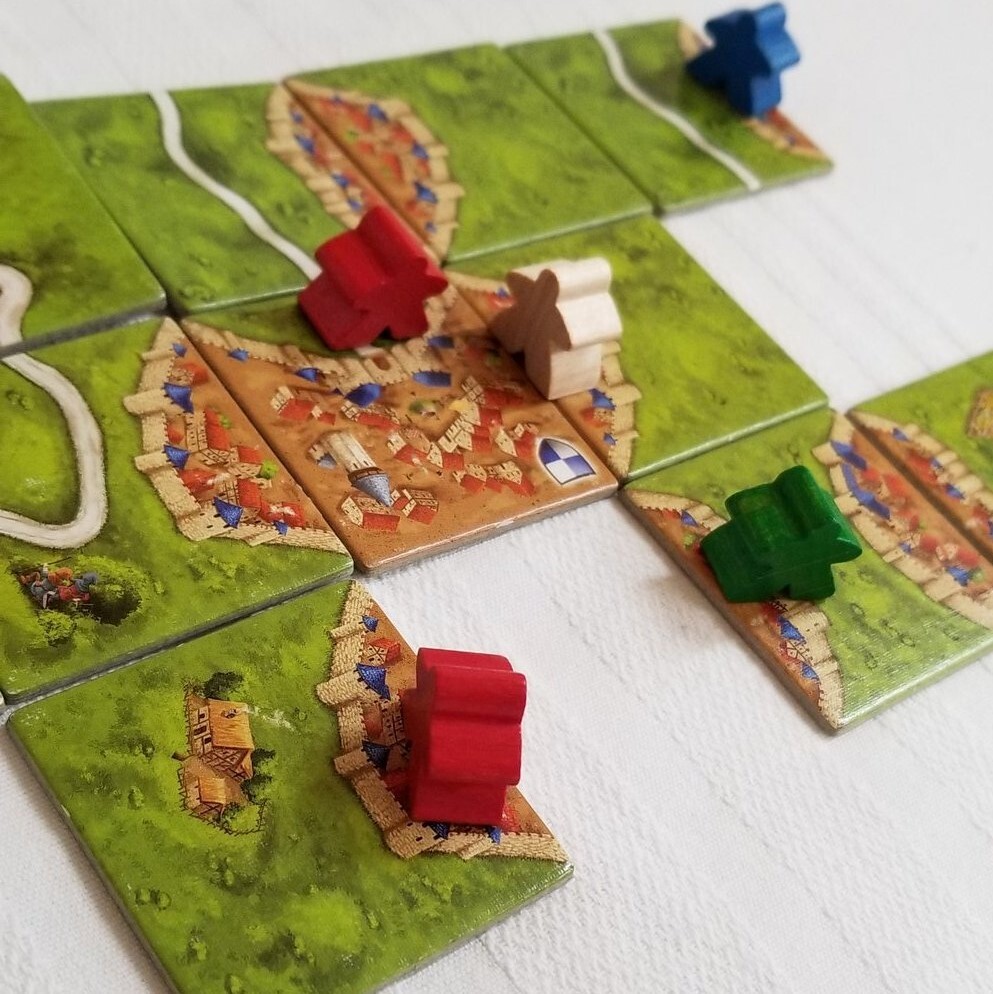 カルカソンヌは競技性が高いゲームとして知られていますが、4人戦もこれがどうして面白い!4人戦の場合は自分が必要なタイルを引く確率が下がりますので、相乗り戦略が基本路線になります。いい点数を作りそうな城塞にはしっかり相乗りに乗り遅れない事が重要。場面に応じて味方のプレイヤーを見極めることが大切です。