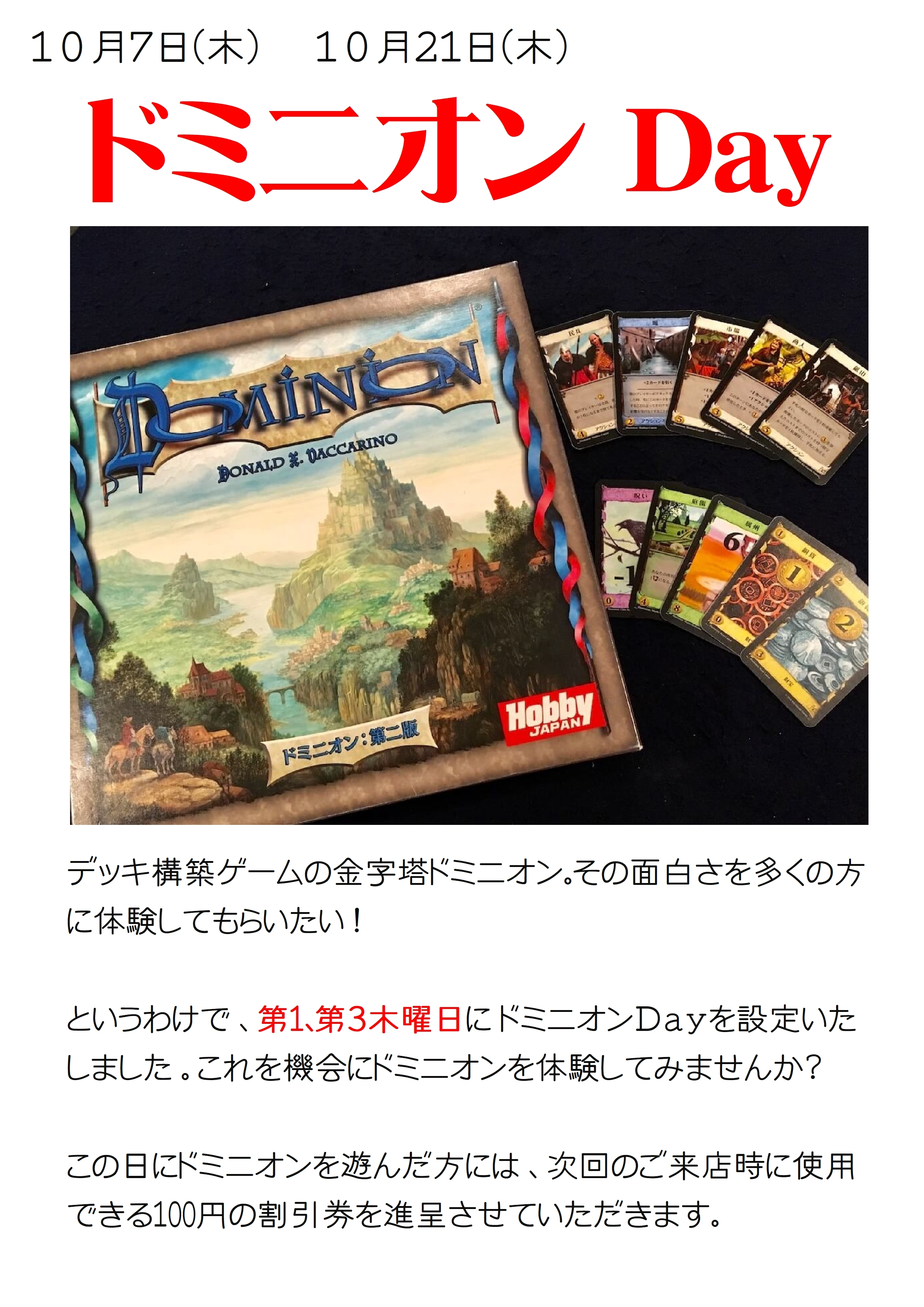 また、本日10/21は「ドミニオンDay」ですので、ドミニオンをプレイされたお客様には次回使用できる割引券を進呈させていただきます。