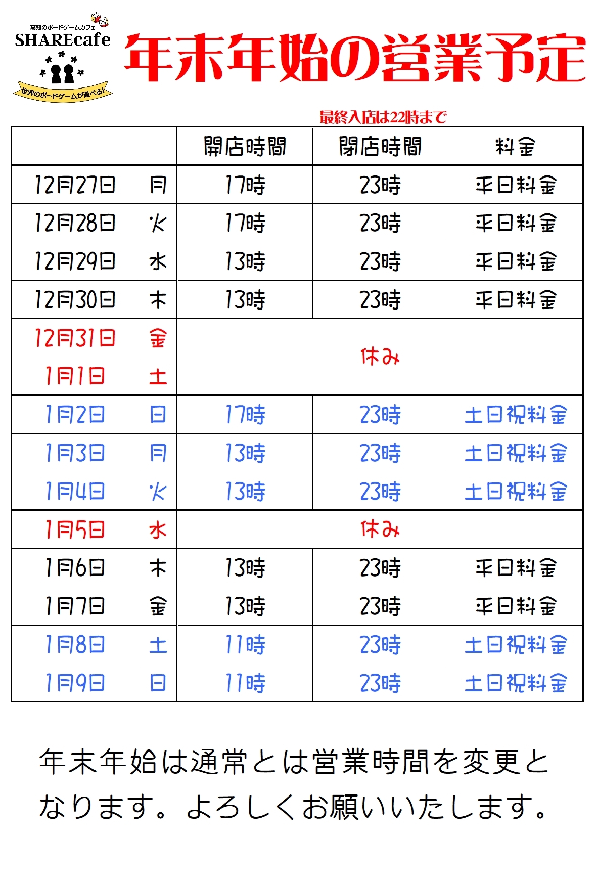 年末年始の営業予定です。通常とは変更となっておりますので、ご注意ください。