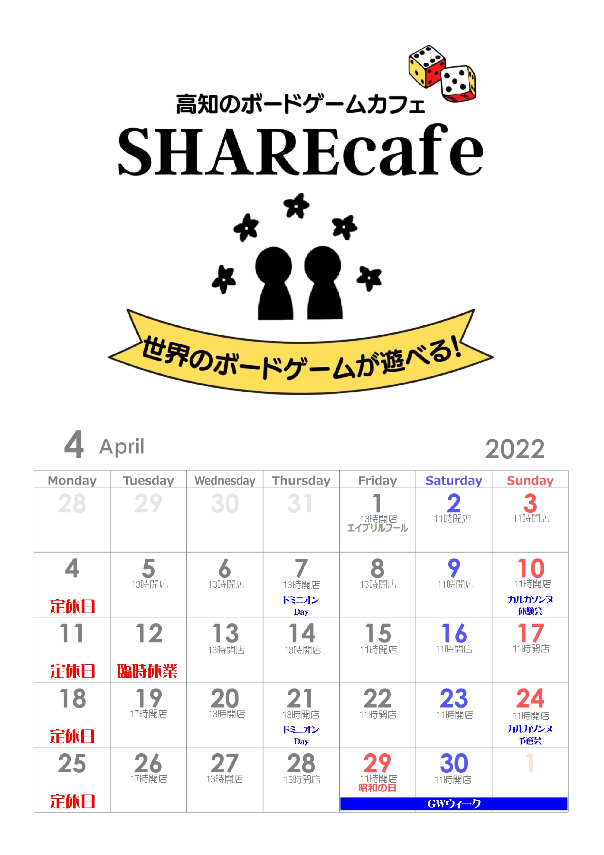 4月の営業カレンダーです
