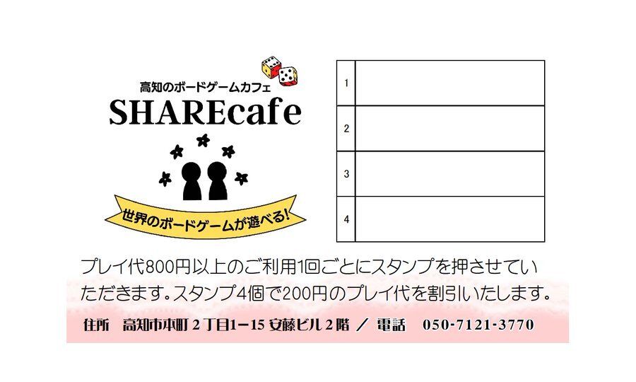 - 約2ヶ月前2025年12月04日 10時19分頃オトクな木曜日は名作を遊んでオトクをGETしよう!毎週木曜日のSHAREcafeは「オトクな木曜日」!この日、「宝石の煌き」「カタン」「バックギャモン」「ラミィキューブ」「カルカソンヌ」「ドミニオン」のいずれかを遊んだお客様には、次回のご来店時にご利用できる100円割引券を進呈いたします!木曜日はSHAREcafeでボードゲームの名作を楽しもう!18ページビュー