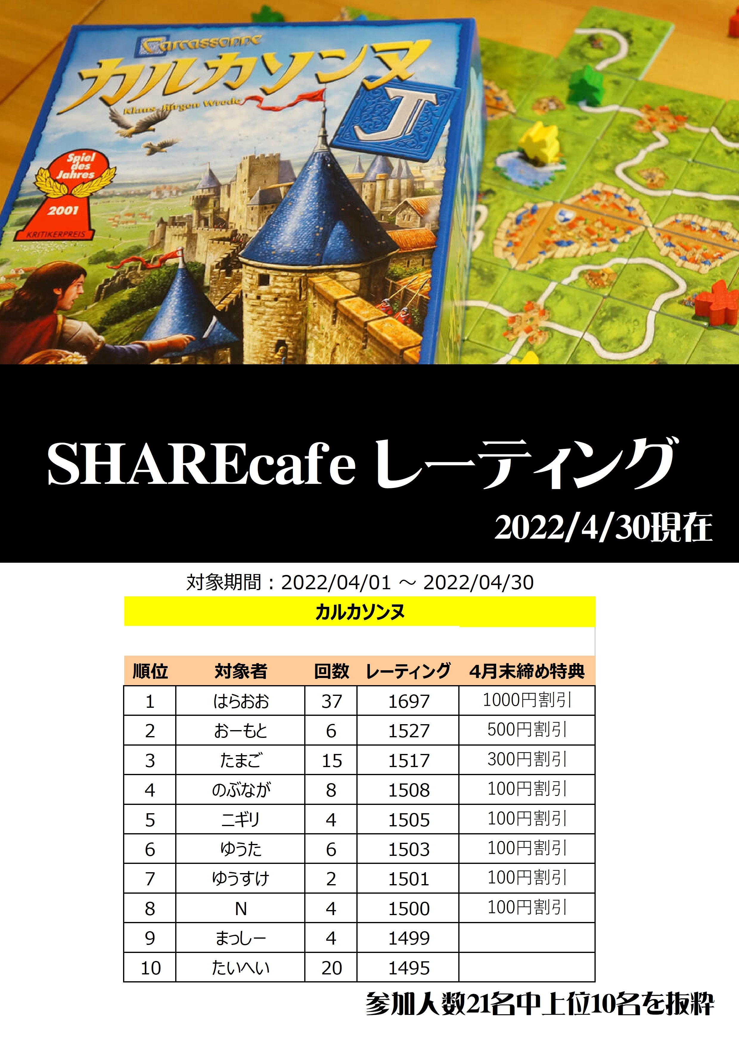 4月より開始したカルカソンヌ・レーティング戦ですが最初の締めを行いました。