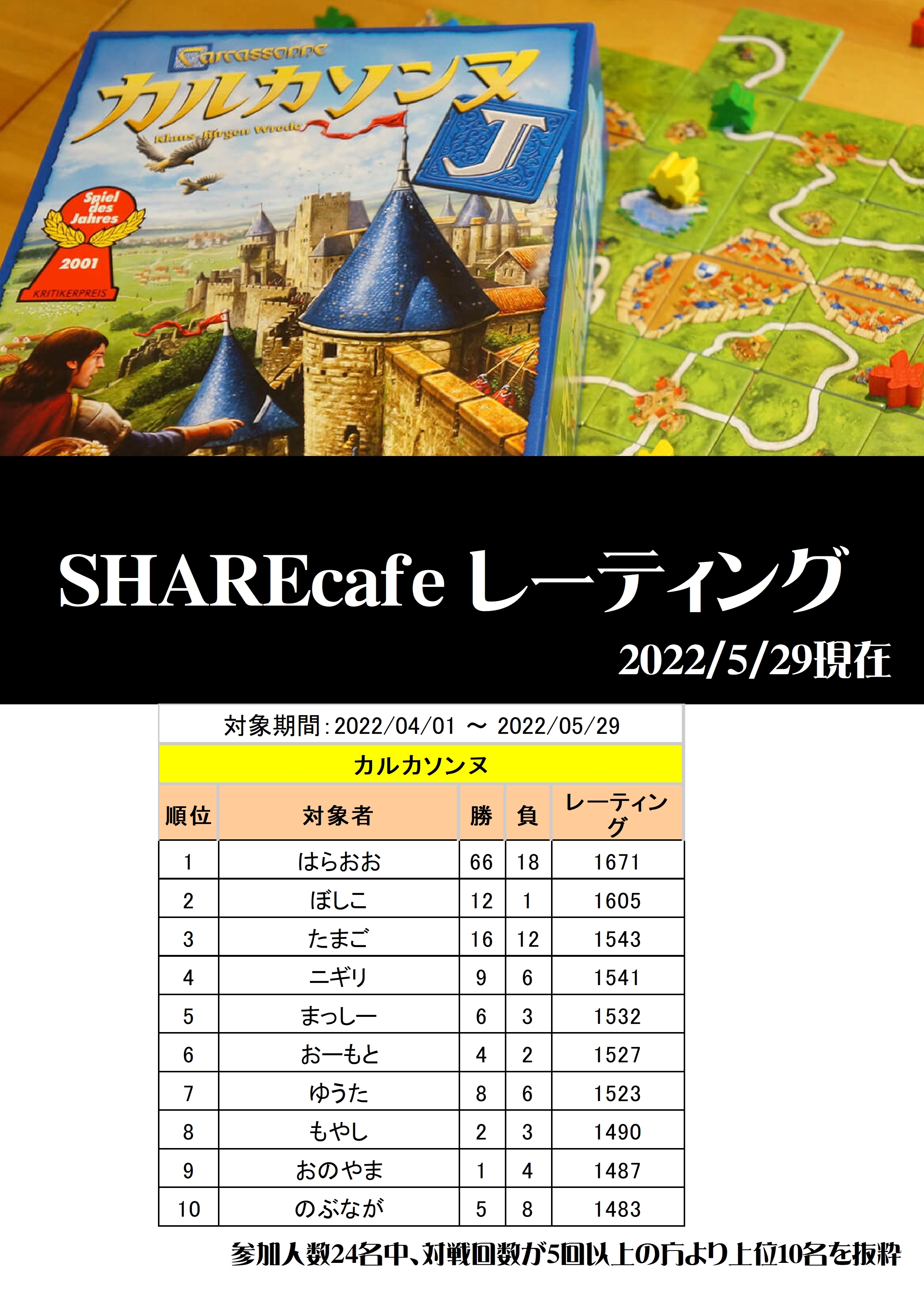 SHAREcafeで行われているカルカソンヌの現在のレーティングです。(5/29更新版)