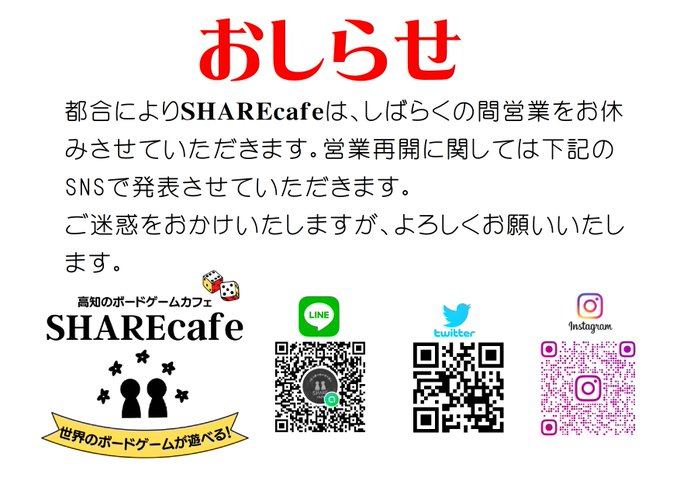 しばらくSHAREcafeはお休みをいただきます。営業再開は不明ですが、お盆中に再開できればと思っております。予定が分かれば改めてお知らせいたします。