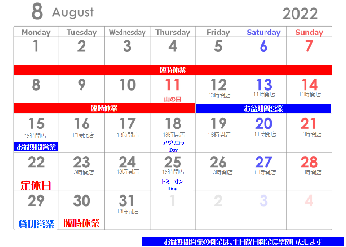 このまま何事も無ければという条件になりますが、8/12(金)より営業を再開する予定です。また、火曜日の営業時間を夏休み対応として変更しております。