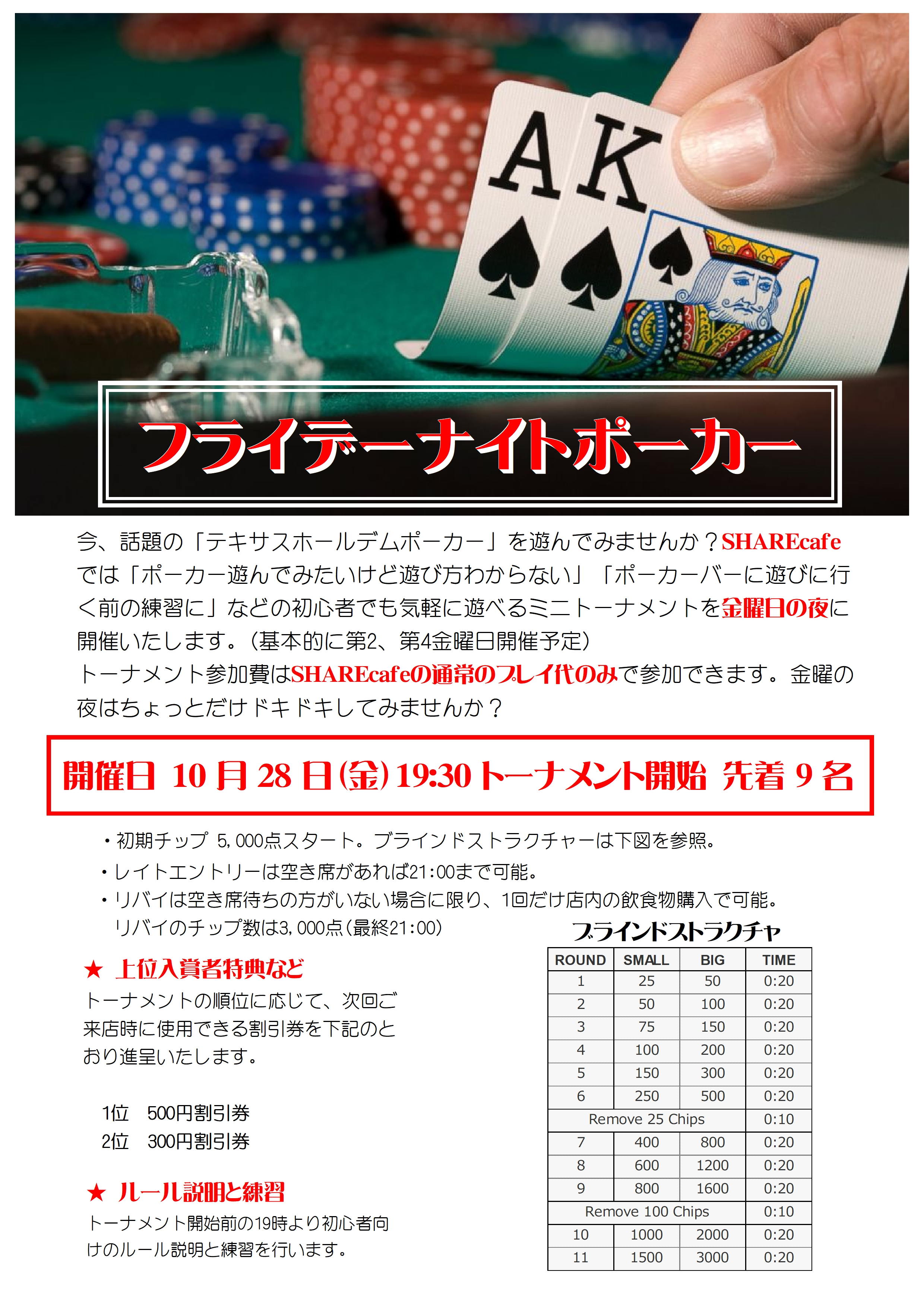 今、話題の「テキサスホールデムポーカー」を遊んでみませんか? トーナメント参加費はSHAREcafeの通常のプレイ代のみで参加できます。