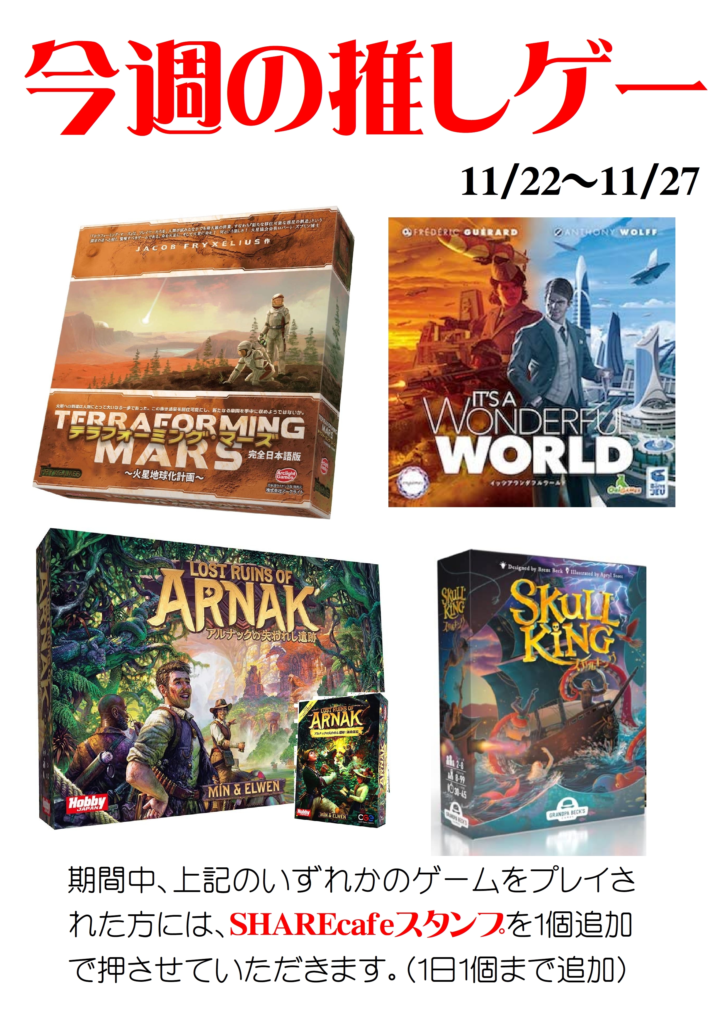 このイベントは週替わりで設定される4つの「推しゲー」をプレイすると、その日のSHAREcafe割引スタンプが追加で1個GET!