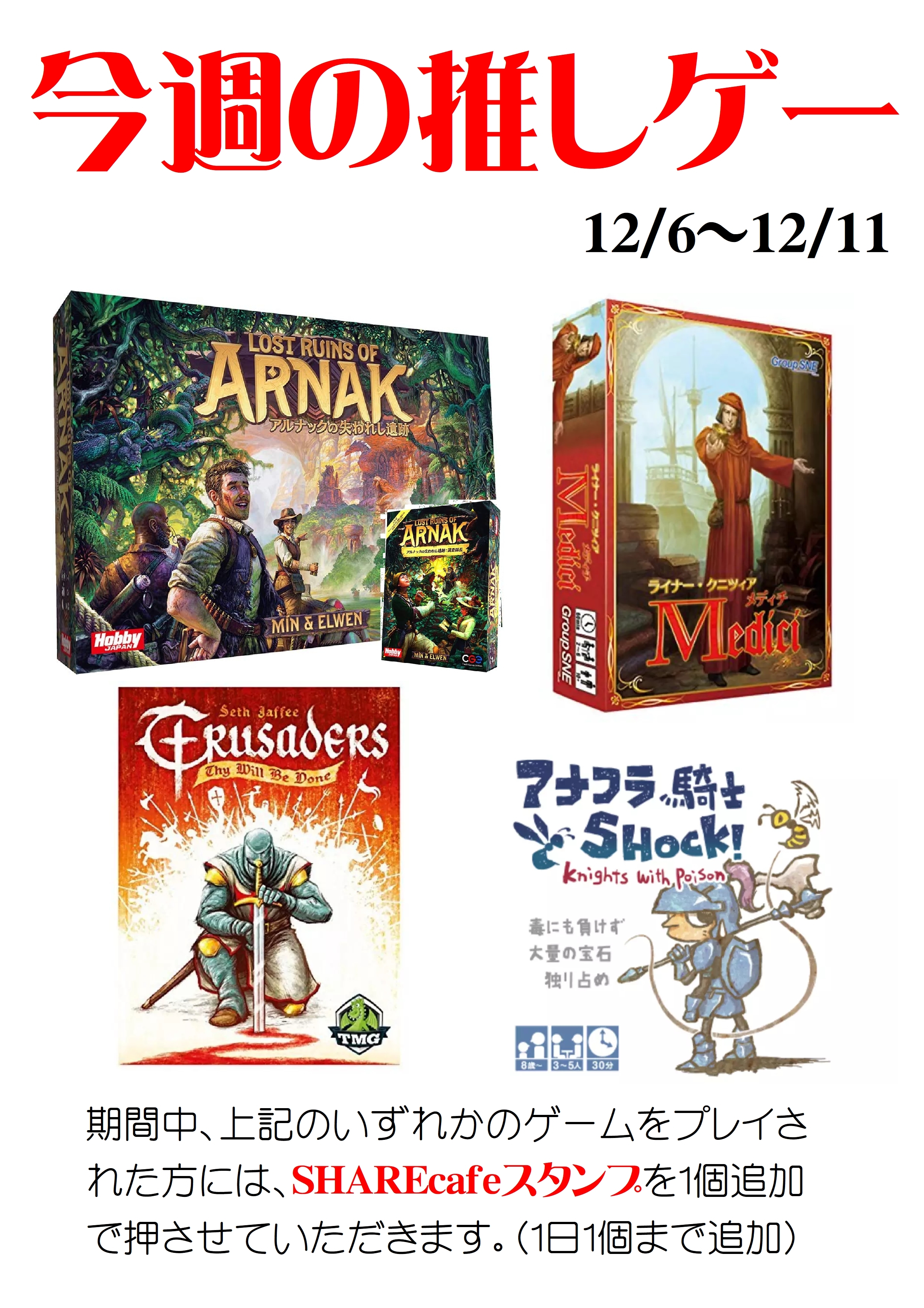 - 約2ヶ月前2025年12月04日 10時19分頃オトクな木曜日は名作を遊んでオトクをGETしよう!毎週木曜日のSHAREcafeは「オトクな木曜日」!この日、「宝石の煌き」「カタン」「バックギャモン」「ラミィキューブ」「カルカソンヌ」「ドミニオン」のいずれかを遊んだお客様には、次回のご来店時にご利用できる100円割引券を進呈いたします!木曜日はSHAREcafeでボードゲームの名作を楽しもう!18ページビュー