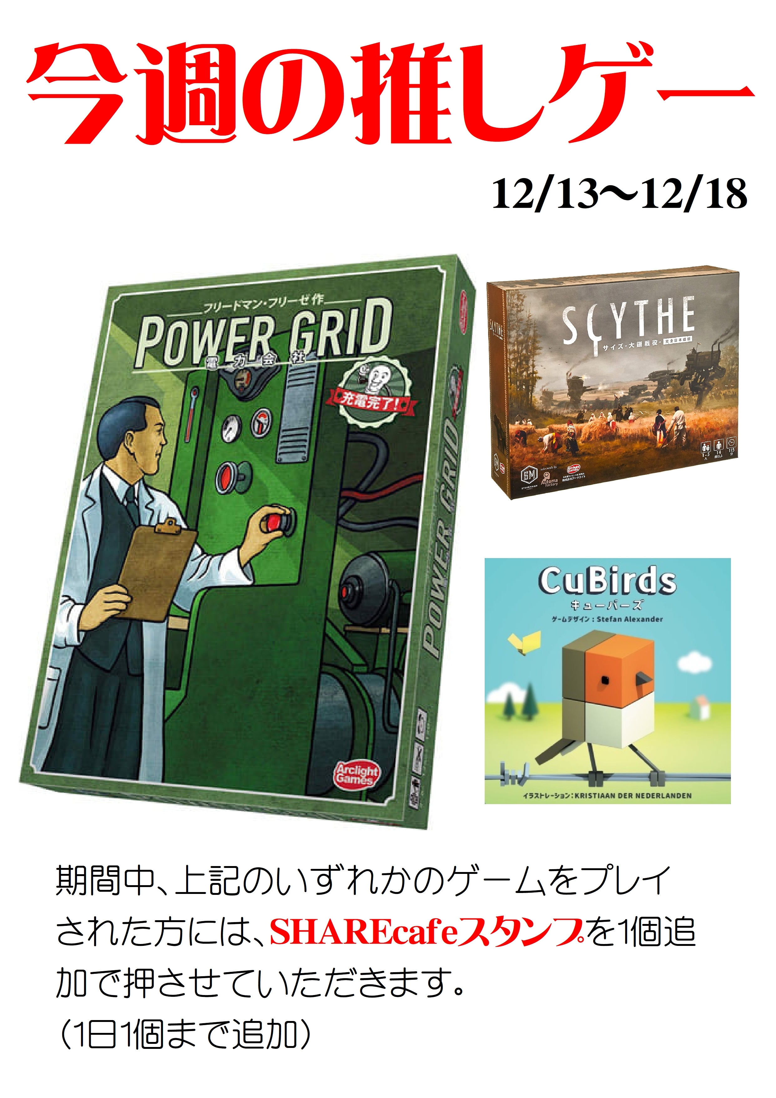- 23日前2026年01月06日 14時26分頃「ボードゲームスタンプラリー」開始!今年の新たな試みとして、中量級ゲームを体験してもらうきっかけとして、スタンプラリーを開催いたします。まずはこちらの6種!2人から4人で遊べるゲームを選んでみました。こちらのゲームを遊ぶたびにスタンプを押します。全てのゲームにスタンプが押されたら、その日のプレイ代を100円割引いたします!1日で...43ページビュー