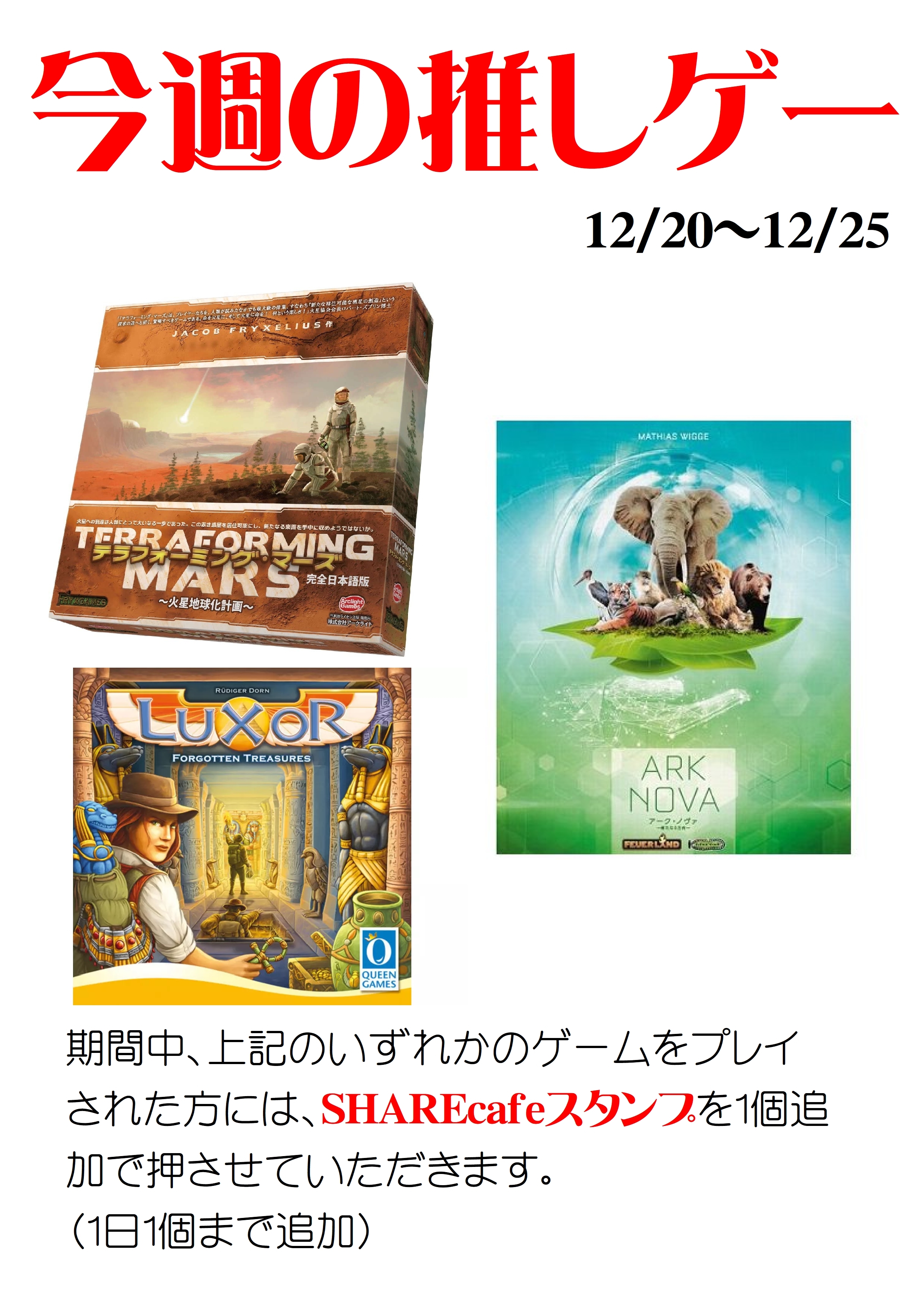 - 23日前2026年01月06日 14時26分頃「ボードゲームスタンプラリー」開始!今年の新たな試みとして、中量級ゲームを体験してもらうきっかけとして、スタンプラリーを開催いたします。まずはこちらの6種!2人から4人で遊べるゲームを選んでみました。こちらのゲームを遊ぶたびにスタンプを押します。全てのゲームにスタンプが押されたら、その日のプレイ代を100円割引いたします!1日で...43ページビュー