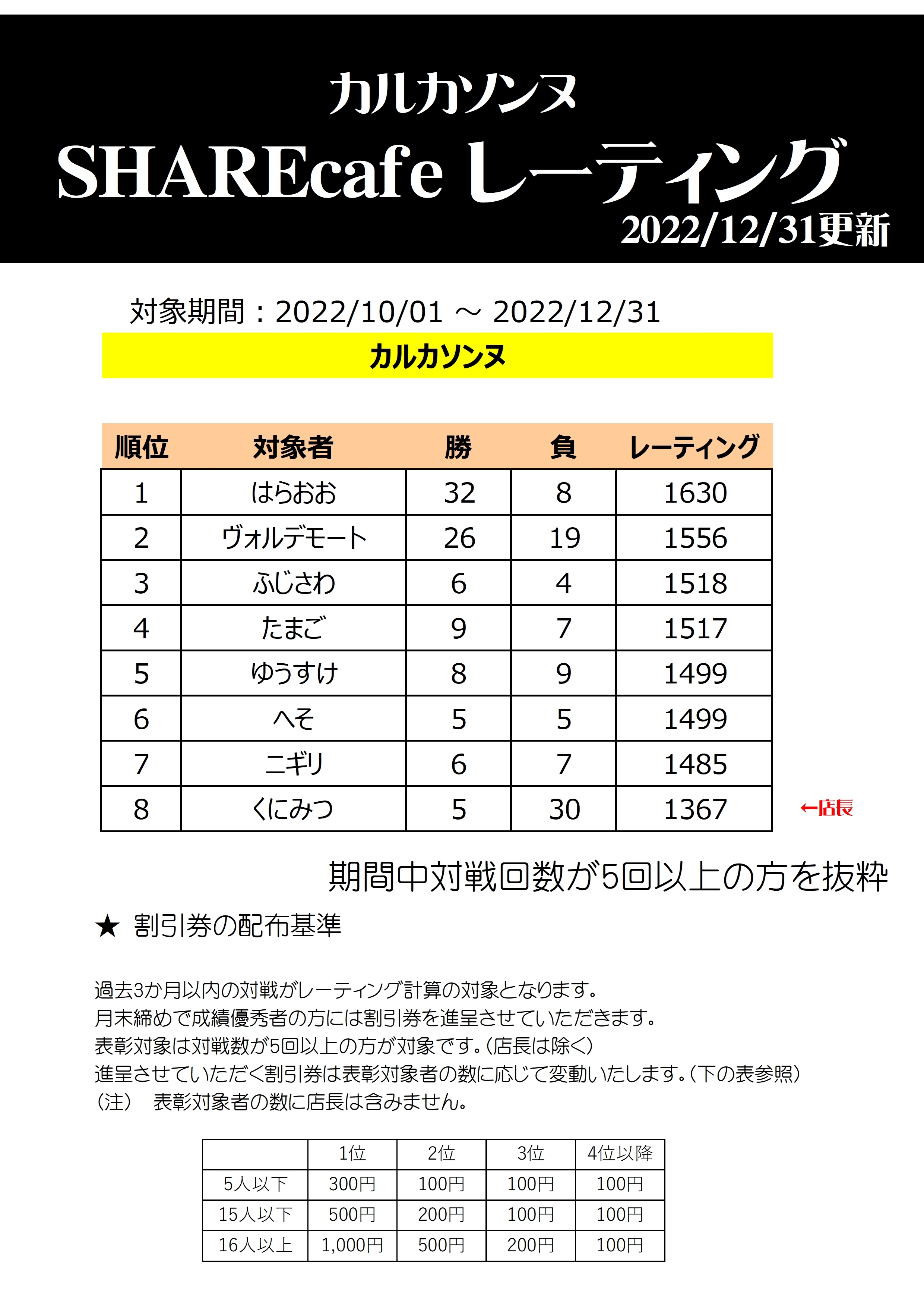 2022年12月末締めのSHAREcafeカルカソンヌレーティングです。表彰対象は2022年10月以降の対戦が5回以上の方です。