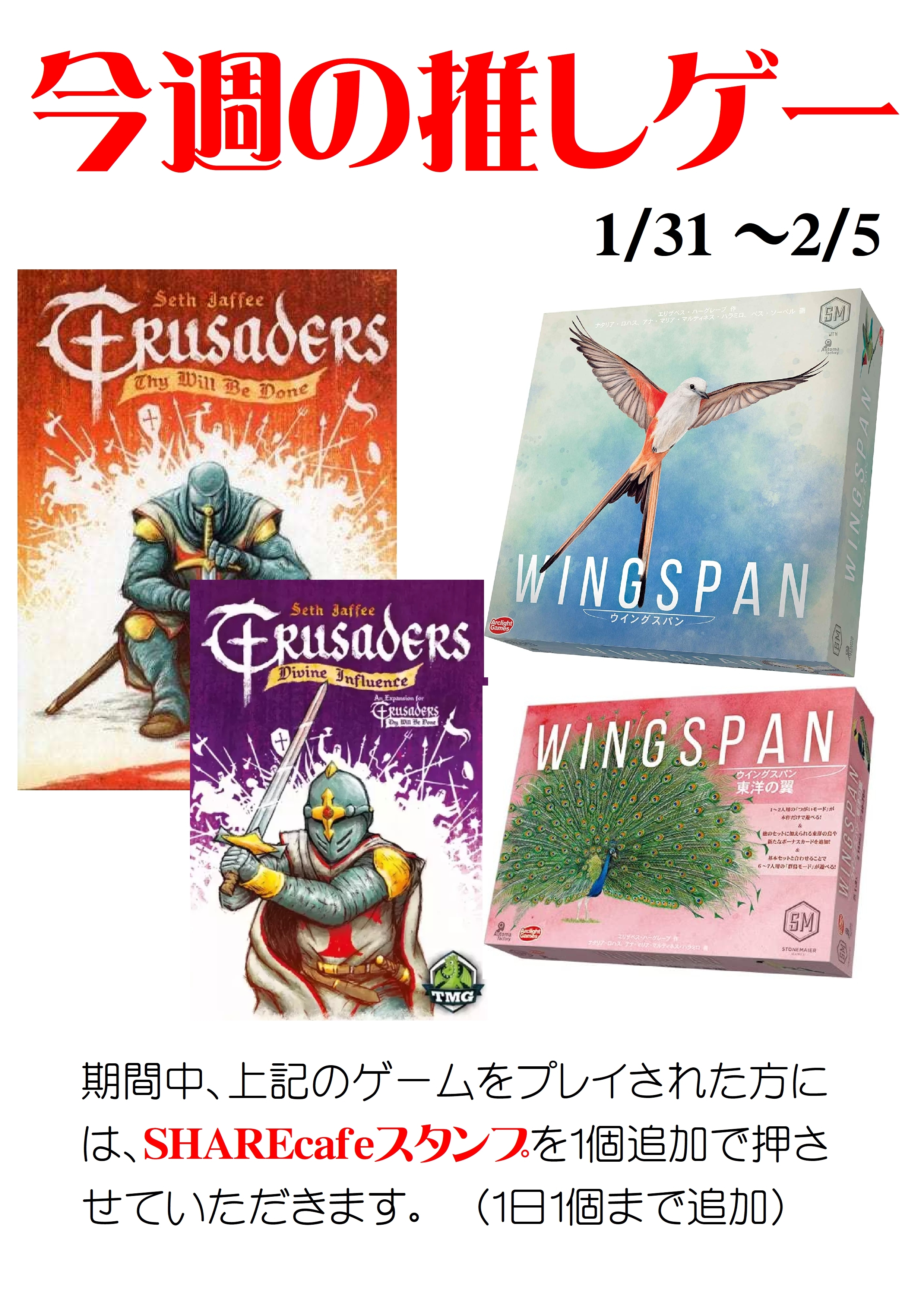 今週の推しゲーは「クルセイダーズ」と「ウイングスパン」の2本です!