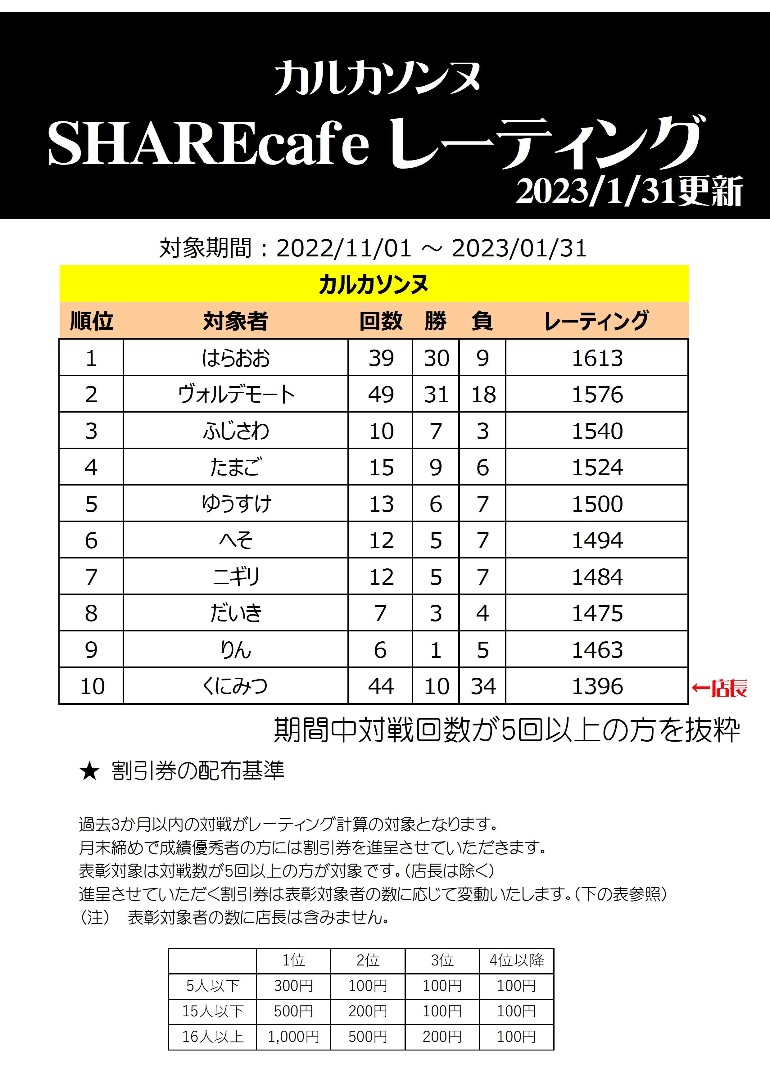 2023年1月末締めのSHAREcafeカルカソンヌレーティングです。表彰対象は2022年11月以降の対戦が5回以上の方です。