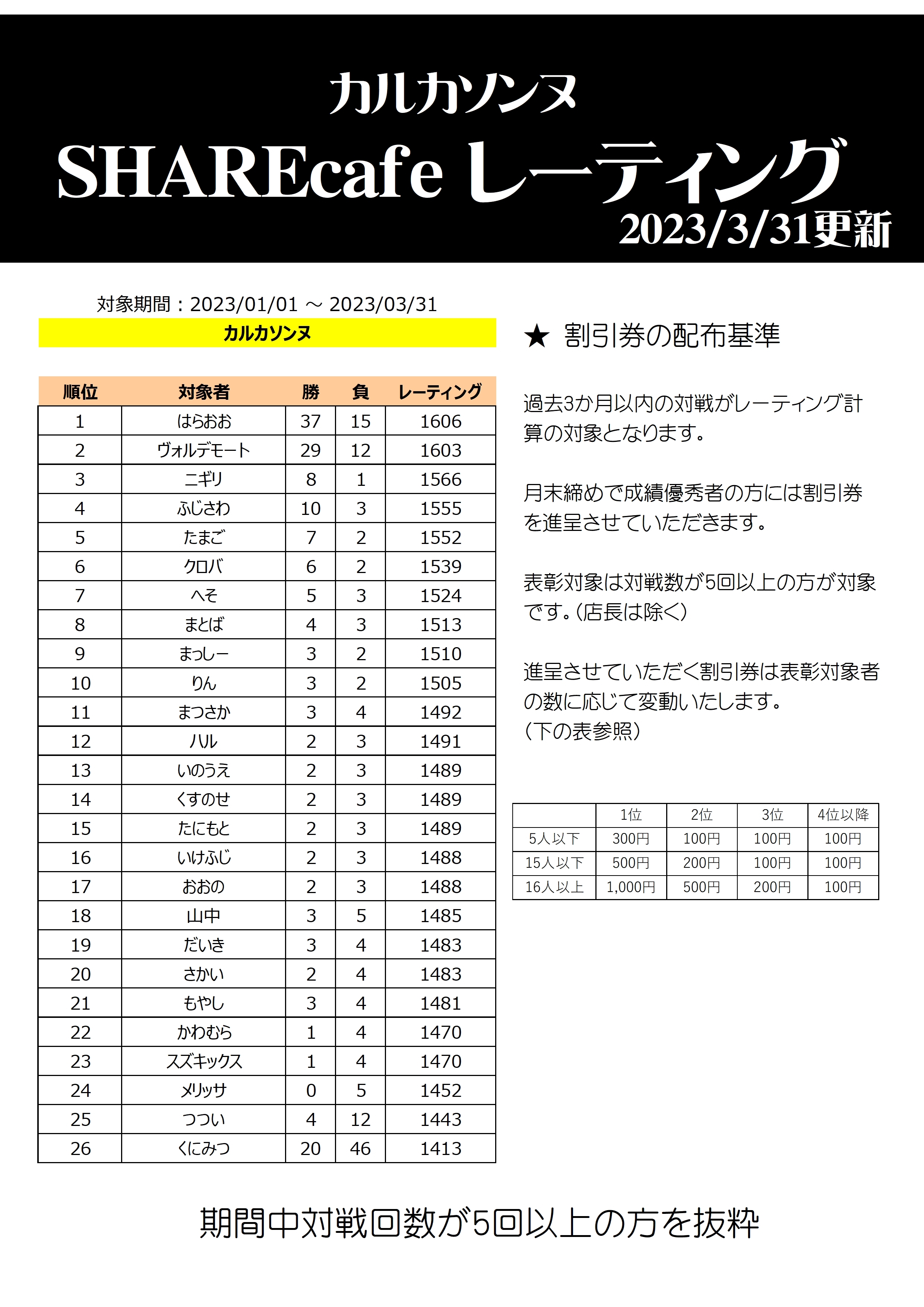過去3か月以内に5回以上対戦された方は、4月中のSHAREcafeでのプレイ代の割引サービスがございます。