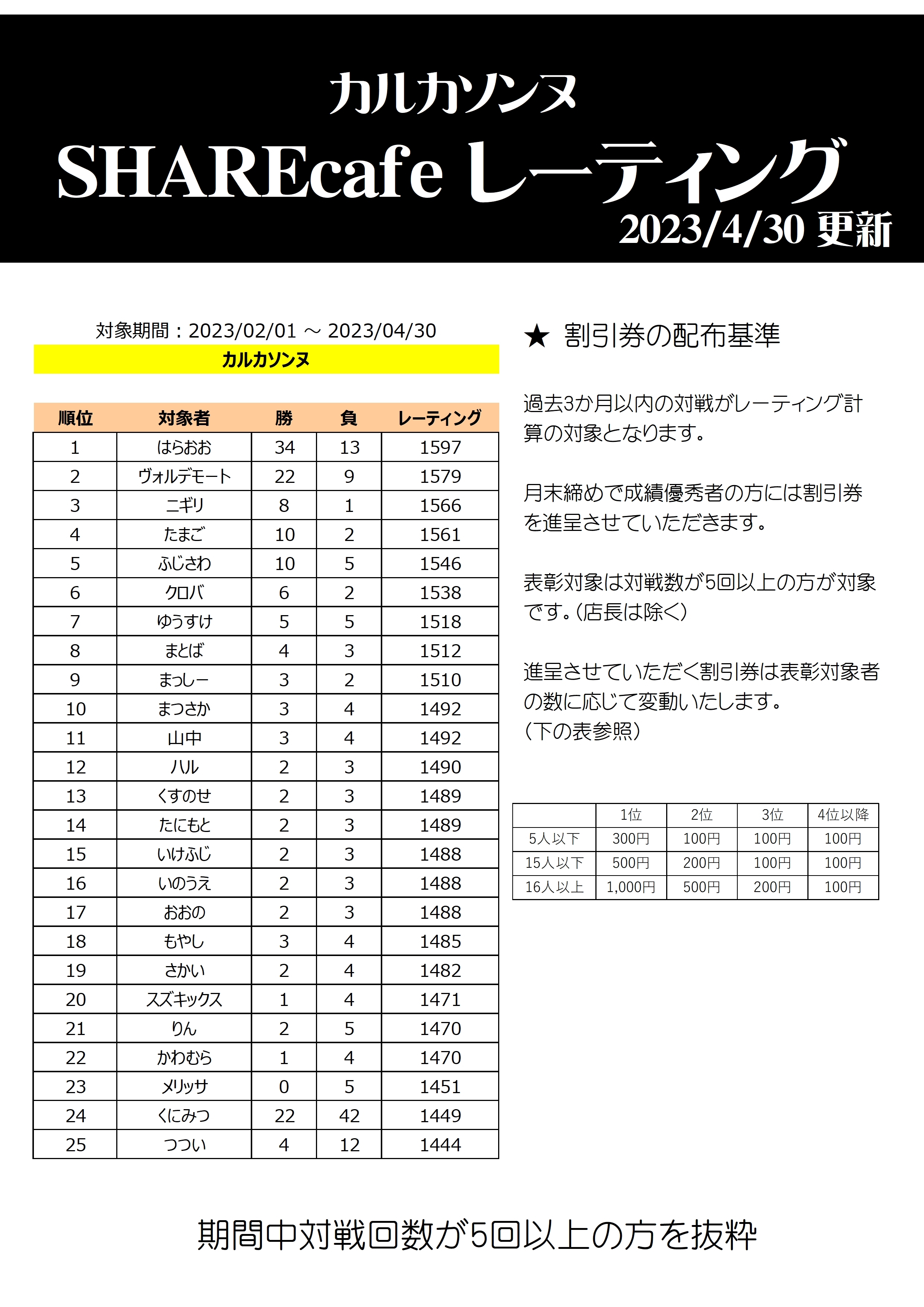 過去3か月以内に5回以上対戦された方は、5月中のSHAREcafeでのプレイ代の割引サービスがございます。