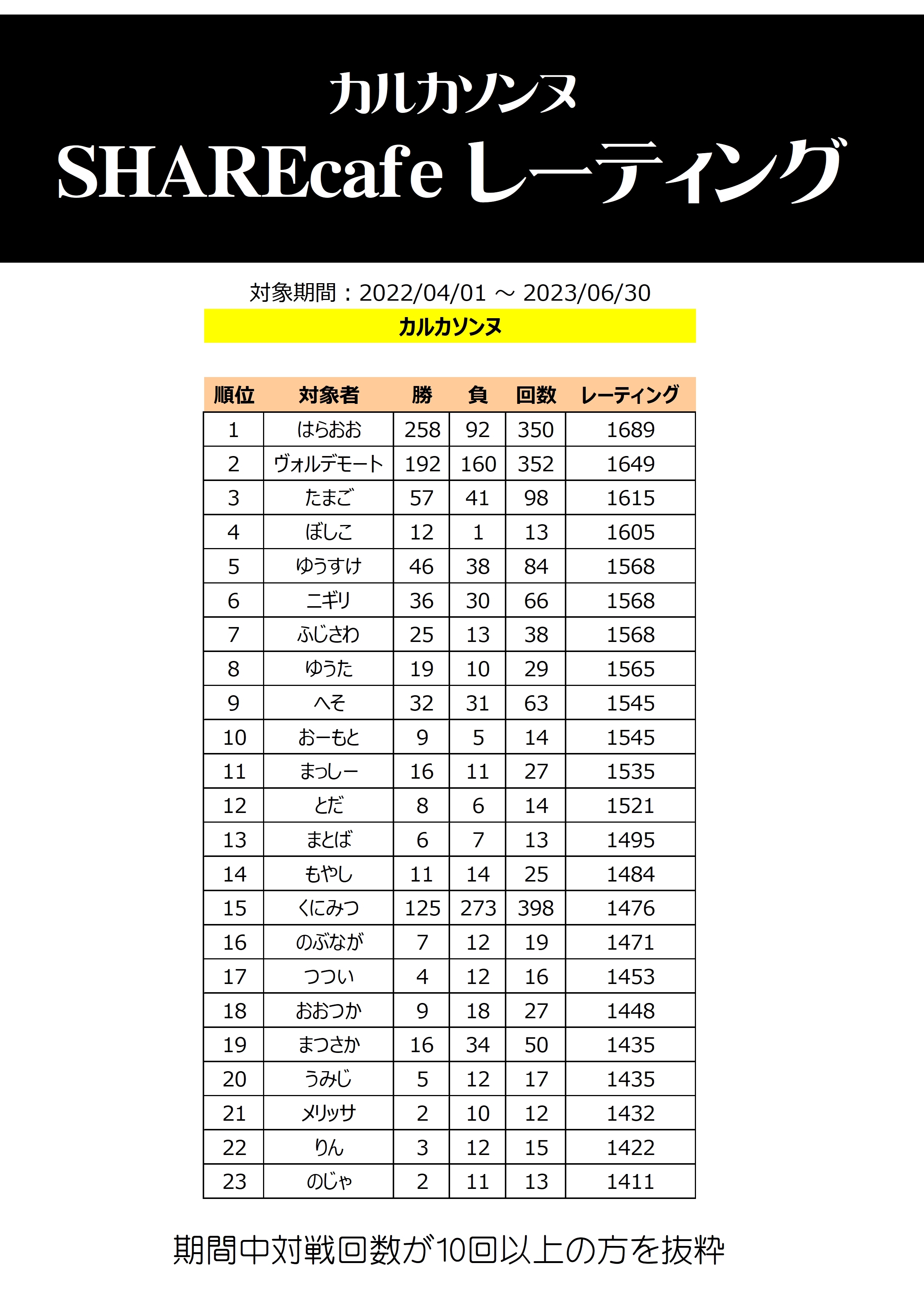 6月をもってカルカソンヌSHAREcafeレーティングですが6月をもって終了いたしましが、開始以降の通算のレーティングはこちらとなります。(2022年4月以降10回以上対戦記録のある方を抜粋)