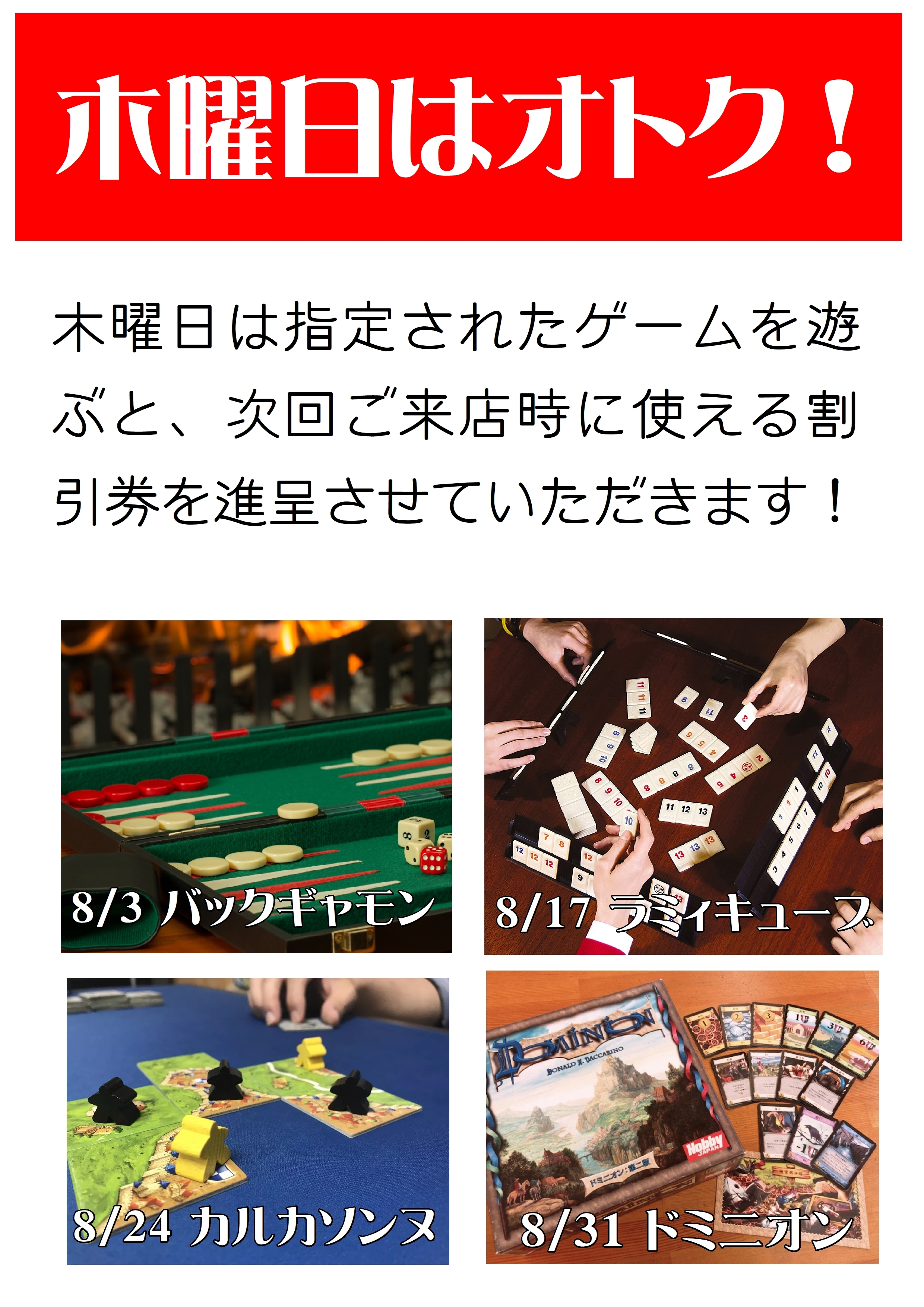 SHAREcafeでは木曜日(8/10以外)に指定にゲームを遊ぶと、次回のご来店時に使用できる100円の割引券を進呈いたします!