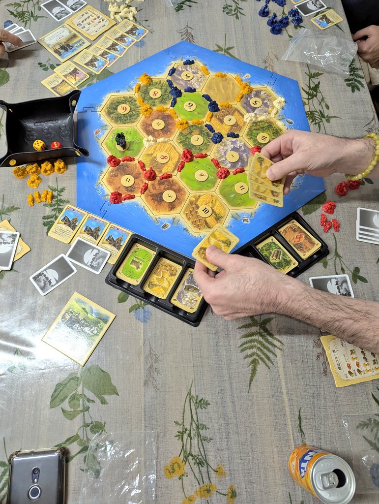 大会終了後はナショナルエコノミー、宝石の煌き、カタンが遊ばれました。ナショナルエコノミー(https://bodoge.hoobby.net/games/national-economy)と宝石の煌き(https://bodoge.hoobby.net/games/splendor)は一緒に遊びどちらも勝たせてもらいました。ナショナルエコノミーはカツカツで何をやったらいいかわからないのが楽しいんですよね。拡大再生産系は大好きです。そして楽しみすぎて宝石の煌きとナショナルエコノミーの写真を撮り忘れてしましました。