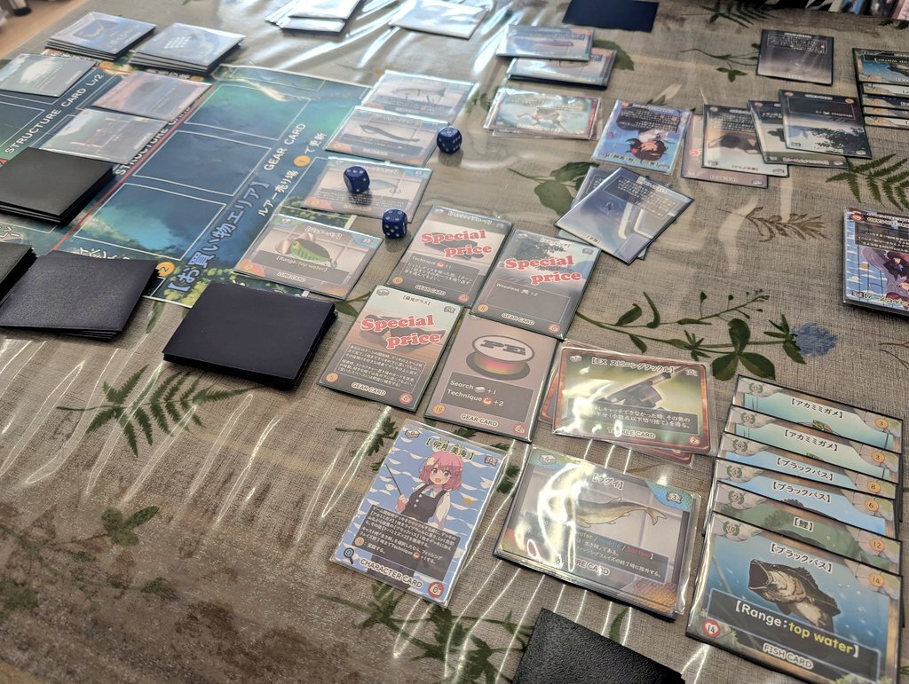 あと前回も遊ばせてもらったランカーフィッシュ(https://bodoge.hoobby.net/games/lunker-fish)を別のキャラクターで遊びました。能力を見た感じでは弱そうだと感じたルアーとは異なり魚がヒットするとなくなってしまう生餌を使ってみました。