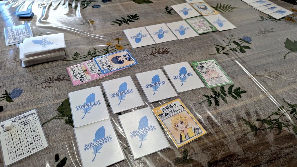 あとは持ち込みの28355!(https://bodoge.hoobby.net/games/28355tsubasa-go-go-)を一緒に遊んでいました。シャニマスの同人ボードゲームでドラフトでメンバーを集めてVo、Da、Viそれぞれで相手よりも高い数値を目指します。