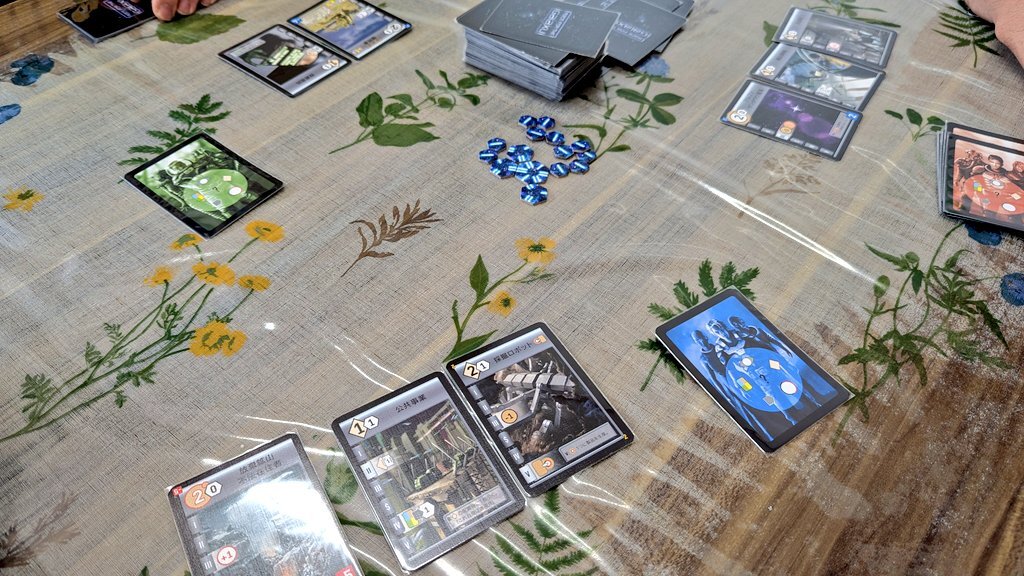 ボドゲももちろん遊んでいました。久しぶりのレース・フォー・ザ・ギャラクシー(https://bodoge.hoobby.net/games/race-galaxy-second-edition)はやっぱり楽しかったです。2戦やって1戦目は茶色生産メインうまく回すことができて1位、2戦目は軍事がうまくいかず中途半端になり、売れる製品も少なく3位でした。