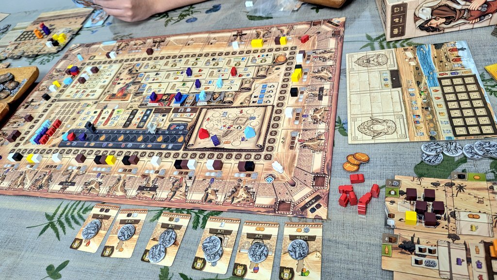 そして蟲神器大会中は持ち込みのエズラとネヘミヤ(https://bodoge.hoobby.net/games/ezra-and-nehemiah)を一緒に遊ばせてもらってました。ラウンド数は少ないのにできることが多くどのルートにするか悩みましたが三種のツボをメインに組み立てました。慣れていなかったので長老と商人のフリーアクションをちょこちょこ忘れてしまっていたのがもったいないなとなりました。