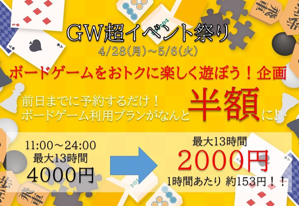 - 8ヶ月前2025年04月22日 14時02分頃GWは予約で超オトクに遊べる‼️GWイベント‼️4/28(月)〜5/6(日)の間、予約するだけで料金が安くなります‼️公式ラインでの予約や、電話・来店での予約どれでも、前日までにご予約頂くだけで、半額で遊べます‼️最大で2000円OFF✨180種類以上のボードゲームが遊び放題です🎵利用方法はとても簡単!前日までに予約をするだ...45ページビュー