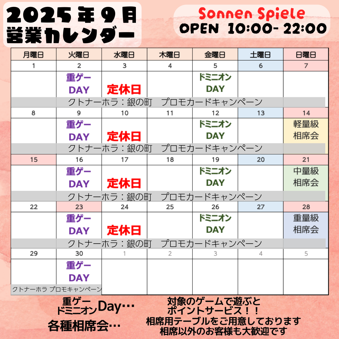 - 3ヶ月前2025年09月20日 11時55分頃📅【2025年10月の営業予定】いつも SonnenSpieleをご利用いただきありがとうございます。10月の営業スケジュールをお知らせいたします。🕙営業時間:10:00〜22:00🎃定休日:毎週水曜日(1日・8日・15日・22日・29日)🎃イベント出展・10月4日(土)イベント出展のため低年齢向けゲームが少なくなっておりま...77ページビュー