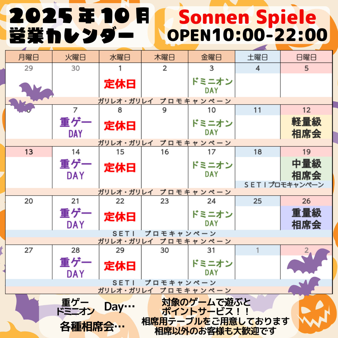 - 3ヶ月前2025年09月20日 11時55分頃📅【2025年10月の営業予定】いつも SonnenSpieleをご利用いただきありがとうございます。10月の営業スケジュールをお知らせいたします。🕙営業時間:10:00〜22:00🎃定休日:毎週水曜日(1日・8日・15日・22日・29日)🎃イベント出展・10月4日(土)イベント出展のため低年齢向けゲームが少なくなっておりま...77ページビュー