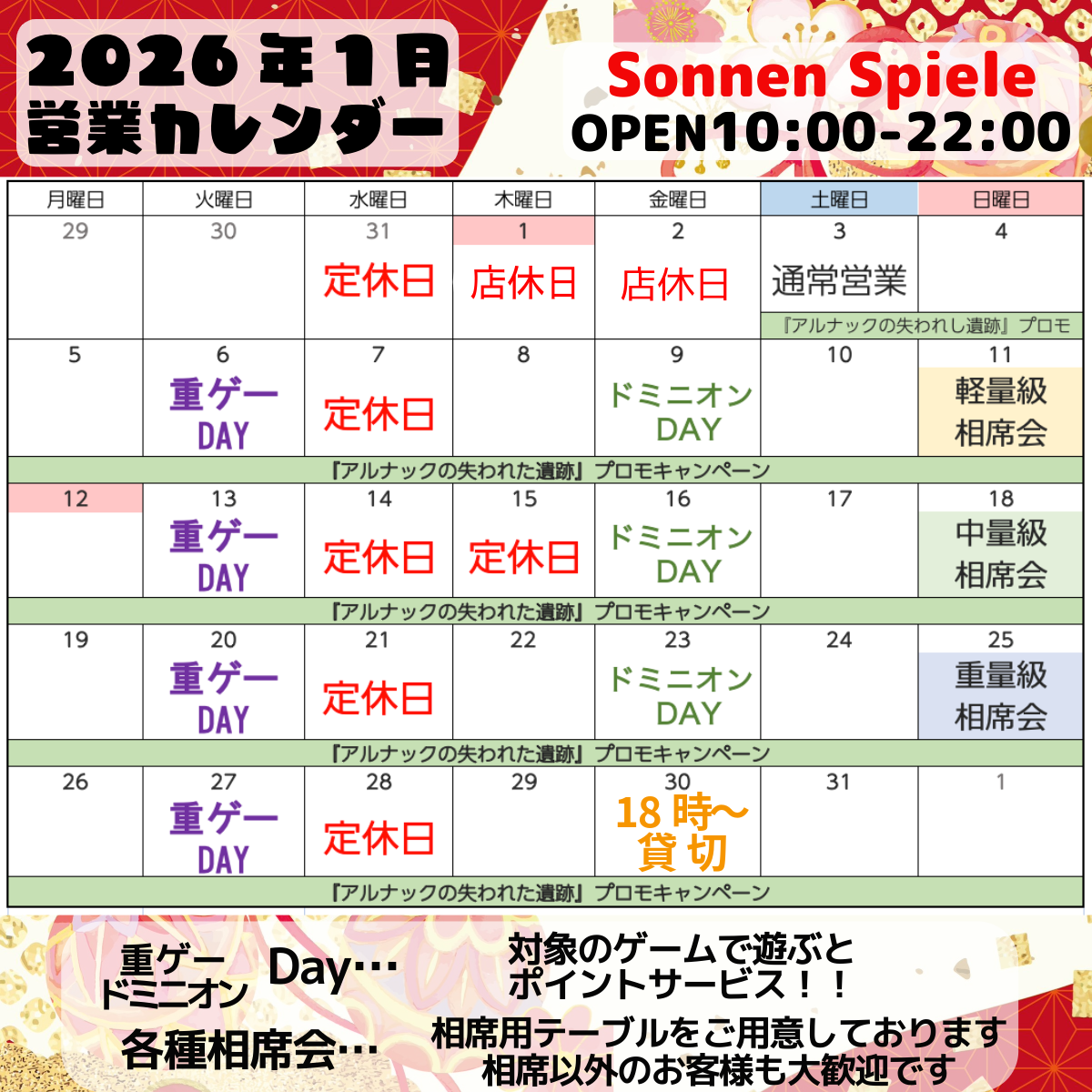 - 約1ヶ月前2025年11月21日 10時31分頃🗓️12月〜年末年始の営業予定📅【2025年12月〜2026年1月の営業予定】いつも SonnenSpiele をご利用いただきありがとうございます。12月および年末年始の営業スケジュールをお知らせいたします。19日(金)13時OPEN29日(月)18時以降貸切営業31日(水)〜1/2(金)店休日🎄プレイホビージャパン!プ...107ページビュー