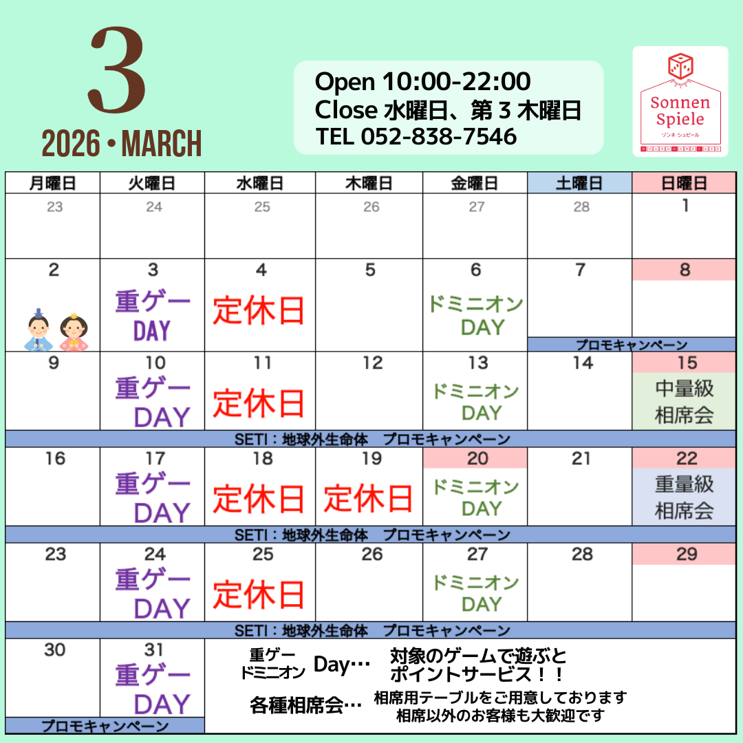 - 3ヶ月前2025年11月21日 10時31分頃🗓️12月〜年末年始の営業予定📅【2025年12月〜2026年1月の営業予定】いつも SonnenSpiele をご利用いただきありがとうございます。12月および年末年始の営業スケジュールをお知らせいたします。19日(金)13時OPEN29日(月)18時以降貸切営業31日(水)〜1/2(金)店休日🎄プレイホビージャパン!プ...139ページビュー