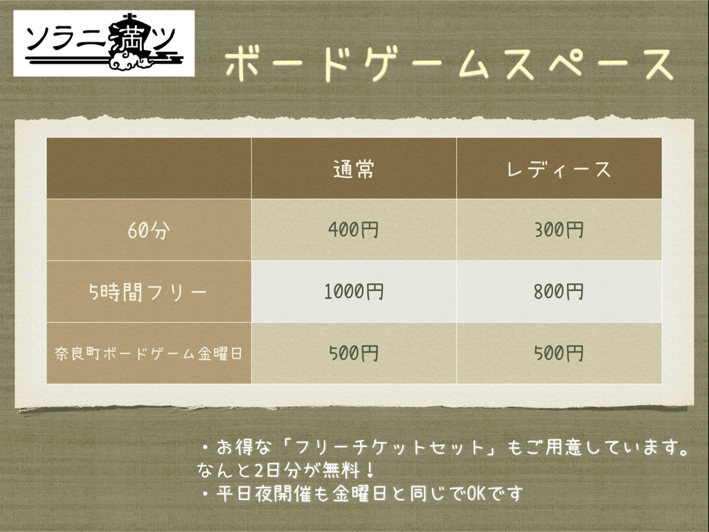 「奈良町ボードゲーム金曜日」はこれまで通り500円です。