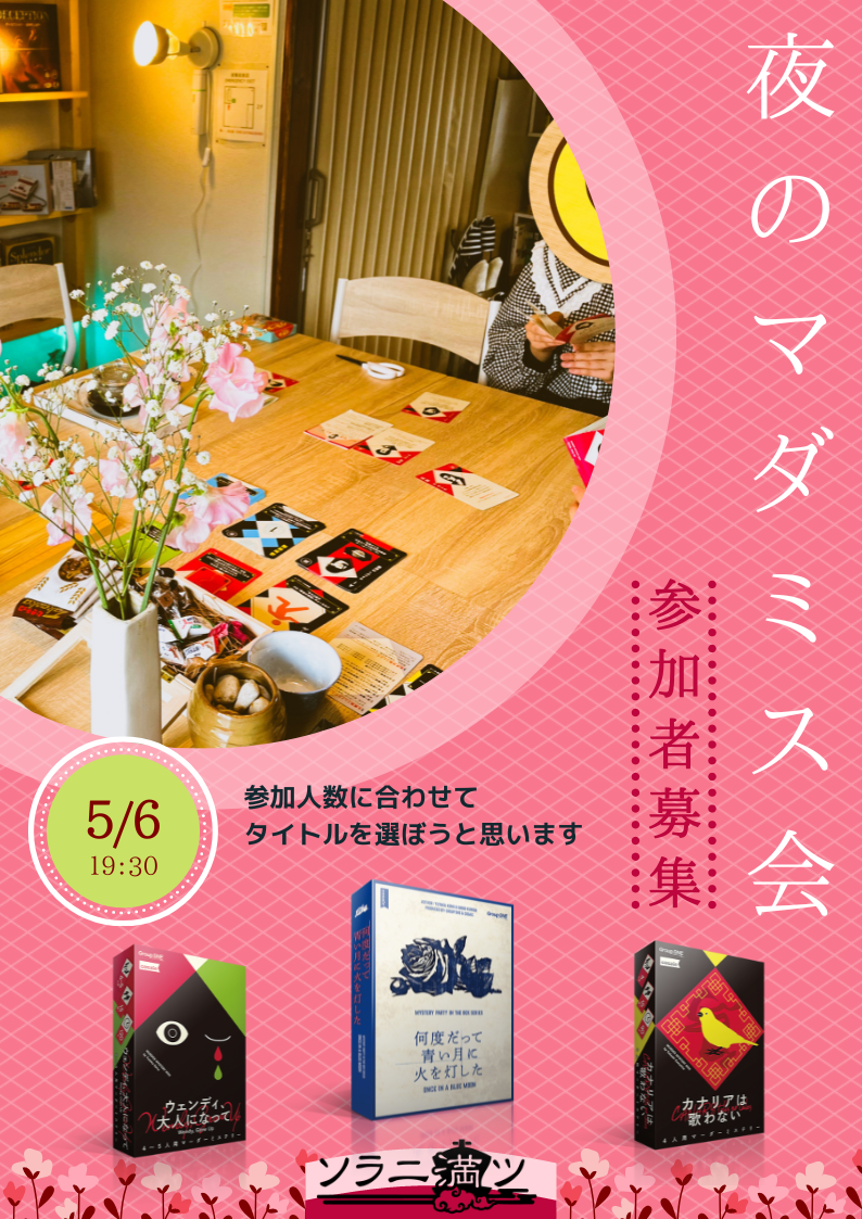 - 8ヶ月前2025年05月02日 10時06分頃5月の営業スケジュールですこんにちは、ソラニ満ツです5月の営業スケジュールです今月もポーカーあり、クイズあり、マダミスありと盛りだくさんの1ヶ月ですぜひお気軽に遊びに来てくださいね79ページビュー