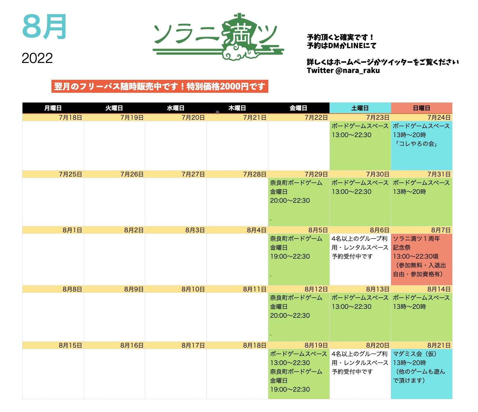 8月の「奈良町ボードゲーム金曜日」は20時スタートの日が多くなってしまいました