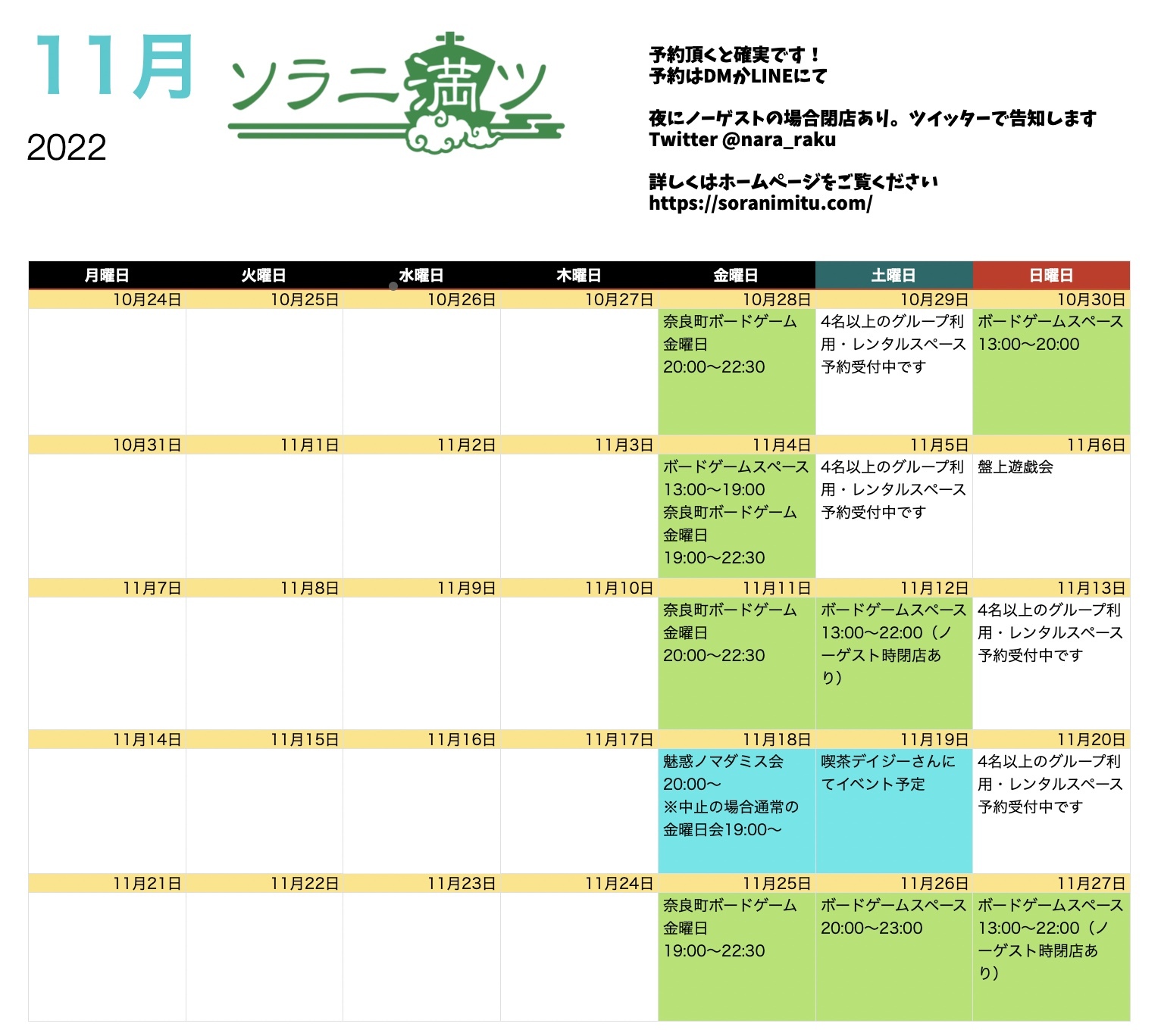 - 6ヶ月前2025年06月07日 11時27分頃6月の営業スケジュールです奈良町のボードゲームスペース「ソラニ満ツ」です6月の営業スケジュールです。今月は20日に奈良町の古民家カフェ「招福庵」さんとのコラボイベントがあります。他にもポーカー会やクイズ会も開催予定です。お気軽に遊びにお越しくださいませ。44ページビュー