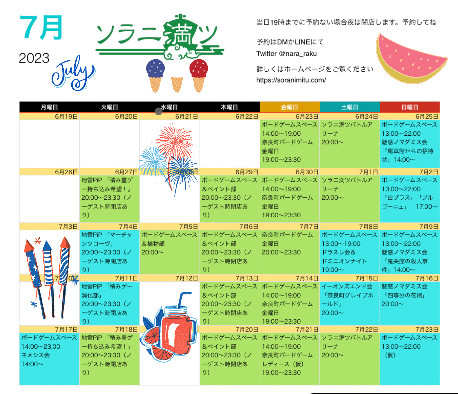- 6ヶ月前2025年06月29日 14時06分頃7月の営業スケジュールですこんにちは。奈良町のボードゲームスペース「ソラニ満ツ」です7月の営業スケジュールです。今月は日曜日にお休み多いですお間違いのないようにお越しくださいませ35ページビュー