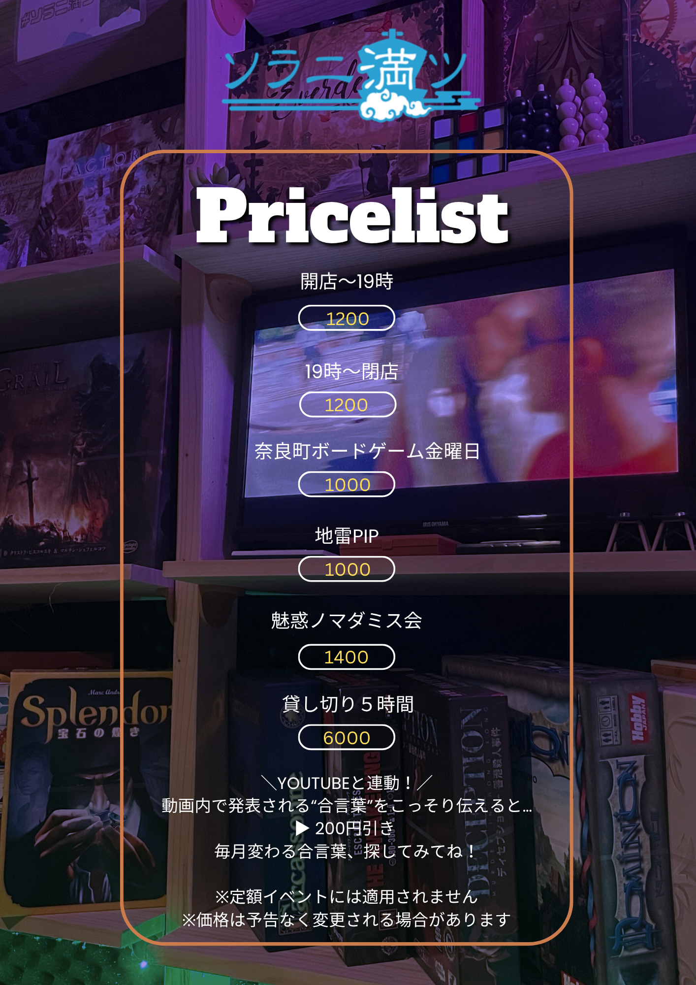 - 5ヶ月前2025年06月29日 14時10分頃料金システム変更のお知らせこんにちは奈良町のボードゲームスペース「ソラニ満ツ」です7月1日より料金システムが変更になります価格表の下にあるように、こっそり合言葉を言ってもらえると料金がお値打ちになります合言葉はソラニ満ツYouTubeチャンネルの動画内にて発表しています動画をよく見ると探しやすくはなってるので、合言葉を...85ページビュー